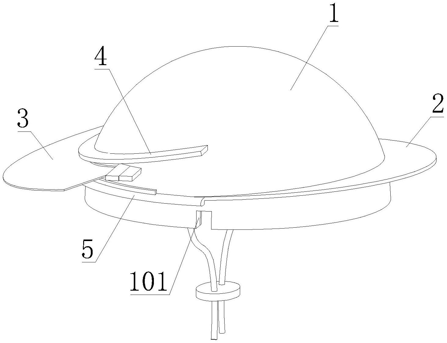 本实用新型涉及防护装置领域,尤其是一种具有防护装置的工地安全帽,包括安全帽本体、帽檐、遮挡板、限位板、支撑板、两个固定板、两个卡柱、两个连接板和两个安装板;帽檐安装在安全帽本体上;两个安装板对称安装在安全帽本体上,两个安装板远离帽檐的一端均设有卡槽;限位板和支撑板均安装在安全帽本体上,限位板位于支撑板的正上方,限位板为半环形板;支撑板的上端面设有支撑垫;两个固定板均安装在遮挡板上;每个连接板的两端分别连接每个固定板和每个卡柱;遮挡板安装状态下,两个卡柱分别配合卡入两个卡槽内。本实用新型通过设置遮挡板便于对雨水进行遮挡和引流,也可以对工人的颈部进行防晒,还便于对遮挡进行拆卸和安装。