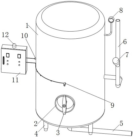 本实用新型公开了高压煲蒸汽开关控制装置,高压煲主体正面下侧设有蒸汽出口;蒸汽出口上安装有手动式开关阀门;高压煲主体正面与开关阀门相对位置安装有光电感应开关;光电感应开关与控制箱电线连接;高压煲主体一侧中部连通有蒸汽进气管;蒸汽进气管上安装有电控流量阀;高压煲主体另一侧安装有插入式温度传感器;控制箱设在高压煲主体一侧;温度传感器与控制箱电路连接;控制箱顶面安装有警报器;本实用新型通过光电感应开关感应开关阀门状态,当开关阀门没有关紧时高压煲主体无法通汽,并通过温度传感器动态控制高压煲主体内部温度,通过警报器可以进行高温报警。