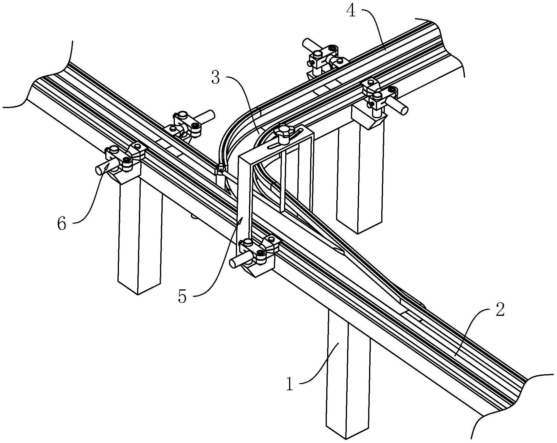 本申请涉及一种用于奶制品运输设备,属于运输设备的技术领域,包括机架、第一输送带、第二输送带、护栏和转向装置,第一输送带安装于机架上,第一输送带直行设置,第二输送带安装于机架上且贴于第一输送带一侧,第二输送带弯曲设置,护栏安装于机架上且位于第一输送带和第二输送带侧边,转向装置安装于机架上,且转向装置位于第一输送带和第二输送带交汇处,转向装置用于改变产品的运输方向,本申请为了节省时间,节约人工成本,提高工作效率,提供了一种用于奶制品运输设备。