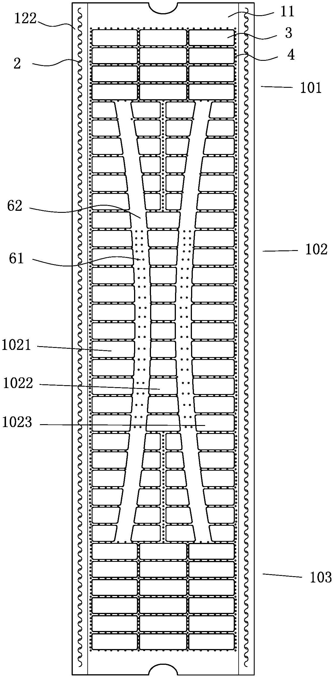 本实用新型涉及一次性卫生用品领域,尤其涉及一种吸收量大且厚度薄的新型超薄芯体,包括芯体本体,定义沿芯体本体的长度方向延伸为纵向方向,沿其宽度方向延伸为横向方向,所述芯体本体包括面层、底层以及分布于面层和底层之间的高分子吸水树脂材料,所述芯体本体上具有若干个相互分离的吸收单元,所述吸收单元的周侧设有第一连接线,通过第一连接线将面层与底层固定连接,使得面层与底层之间形成一容腔,所述高分子吸水树脂材料填充于所述容腔内,所述芯体本体的中部设有导流槽,所述导流槽具有位于纵向中部的压合区以及位于纵向两端的粘合区。