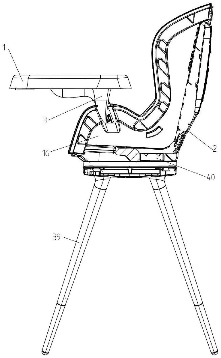 本实用新型涉及一种带餐台的儿童餐椅,包括餐台和椅座,椅座底部设有椅腿,餐台和椅座连接,所述椅座上设有扶手,餐台与扶手可拆卸式连接,扶手与餐台之间设有导电组件,椅座上设有电源,电源与导电组件电连接。本实用新型得到的一种带餐台的儿童餐椅,具有以下优点:用导电组件将餐台和椅座上的电路导通,将电源与餐台上用电模块分离,减轻了餐台的重量,便于餐台的拆卸组装,在对餐台单独收纳时更加安全。