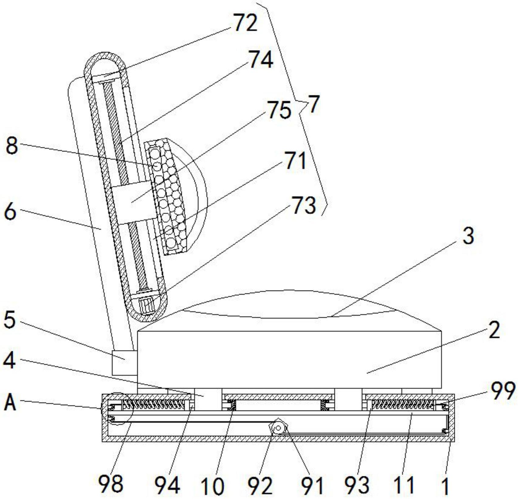 本实用新型涉及安全座椅技术领域,且公开了一种具有头枕组件的儿童安全座椅,包括底座和安装座,所述安装座位于底座的顶部,所述安装座的顶部设置有坐垫,所述安装座的底部设置有一端延伸至底座内部且数量为两个的支撑柱,所述安装座的左侧设置有延伸块,所述延伸块的顶部设置有靠板,所述底座的内顶壁设置有数量为两个且位于两个支撑柱之间的卡块,所述底座的内壁左右两侧之间设置有与两个支撑柱底部贴合且与两个卡块连接的横板,所述靠板的右侧设置有位于坐垫上方的调节组件。该具有头枕组件的儿童安全座椅,可使用者根据需求自动调整头枕的高度,有效帮助使用者对安全座椅进行拆装更换,方便了使用者使用。