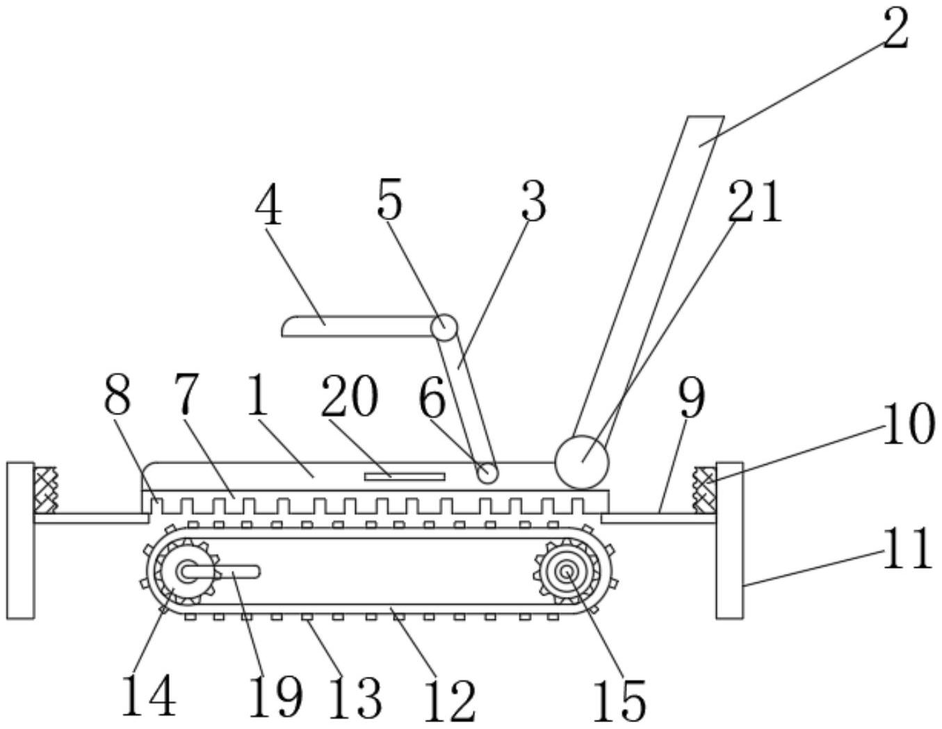 本实用新型公开了一种可调节型汽车座椅结构,包括座垫、传送带和转动齿轮一,所述座垫底端固定连接有固定板,所述固定板底端表面设置有卡槽,所述座垫下端设置有传送带,所述传送带表面设置有卡齿,所述传送带内部一侧设置有转动齿轮一,所述传送带内部另一侧设置有转动齿轮二,所述转动齿轮一表便固定连接有固定槽,所述转动齿轮一中间设置固定连接有伸缩杆,所述伸缩杆另一端设置有转轴三,所述转轴三另一端转动连接有转动把手,通过设置的转动齿轮一,能够通过转动转动齿轮一使传送带转动,通过设置的伸缩杆,能够使转动把手移动到固定槽和从固定槽上脱离,通过设置的转轴三,能够使转动把手进行转动。