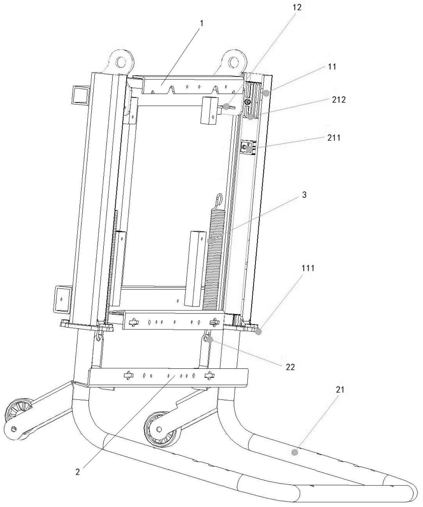 本发明公开了一种小腿伸缩结构,本发明实施例的小腿伸缩结构通过设置有一边开口的导轨11与导向管配合,实现伸缩,通过止动块和限位滑块配合实现最长伸缩限位,使得导向管在两侧导轨内可同步伸缩,避免伸缩过程中的卡顿问题,提升用户体验。同时导轨一侧开口为导向管的伸缩提供了较大的预留量,从而可降低导向管的制造精度,降低成本,且导轨一侧开口可方便维修添加润滑油等,延长小腿伸缩结构的使用寿命,进一步地降低成本。