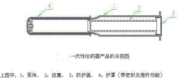本实用新型公开了一种用于妇科阴道给药的一次性给药器,包括泵体、活塞、防护盖与护罩,其特征在于:护罩尺寸小于泵体内腔,除去防护盖后,取下的护罩可转变为推杆,推动活塞从出药孔挤出泵体前腔的药物,并送达阴道中病变部位。本实用新型同时带有密封及推杆作用的护罩设计具有结构简单使用方便的特点;一次性用完,避免药物二次污染的可能性;密封的泵体前腔能严格控制药物剂量,提高用药效率;泵体长度可以有效控制阴道用药的深度,提高给药点的准确度。
