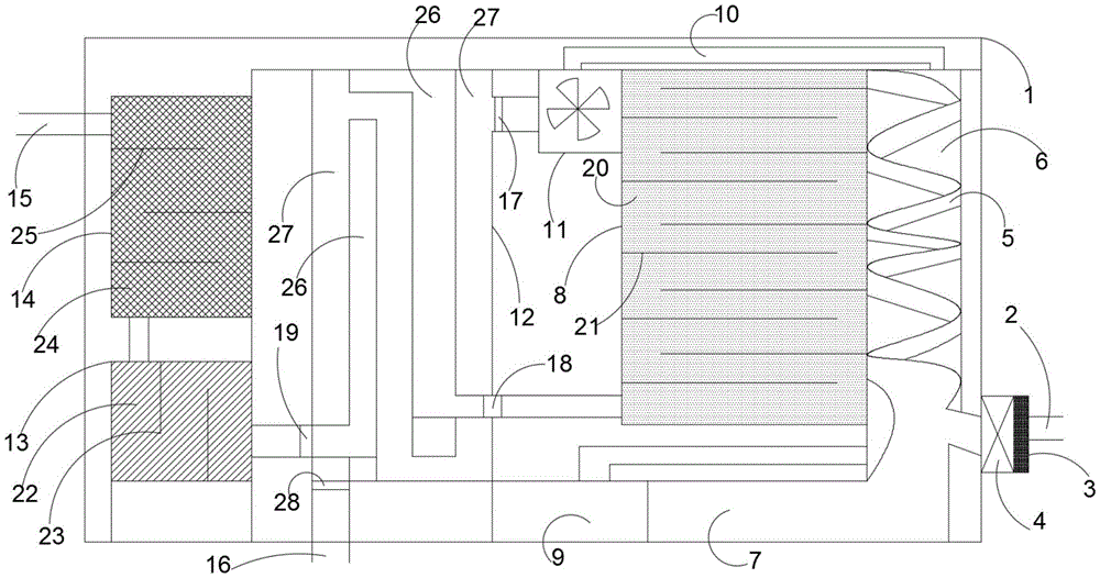 本实用新型提供一种冷冻式空气干燥器,空气入口设置有抽风机,抽风机设置有灰尘过滤网,干燥器主体内设置有一号冷冻腔,一号冷冻腔内设置有冷冻管,冷冻管一端与抽风机的出风口连接,另一端与活性炭过滤箱连通,冷凝水箱与冷冻管连通,一号冷冻腔一端与冷煤气体发生器连接,另一端通过输送管与导流风机连接,导流风机与二号冷冻腔的冷媒气体进气口连接,活性炭过滤箱与二号冷冻腔连接,二号冷冻腔与氯化钙过滤箱连接,氯化钙过滤箱与硫酸钙过滤箱连接。本实用新型解决了现有的冷冻式压缩空气干燥机,不带有过滤空气功能,容易导致管道堵塞,空气干燥时间太短,使干燥剂不能充分吸收水分的问题。