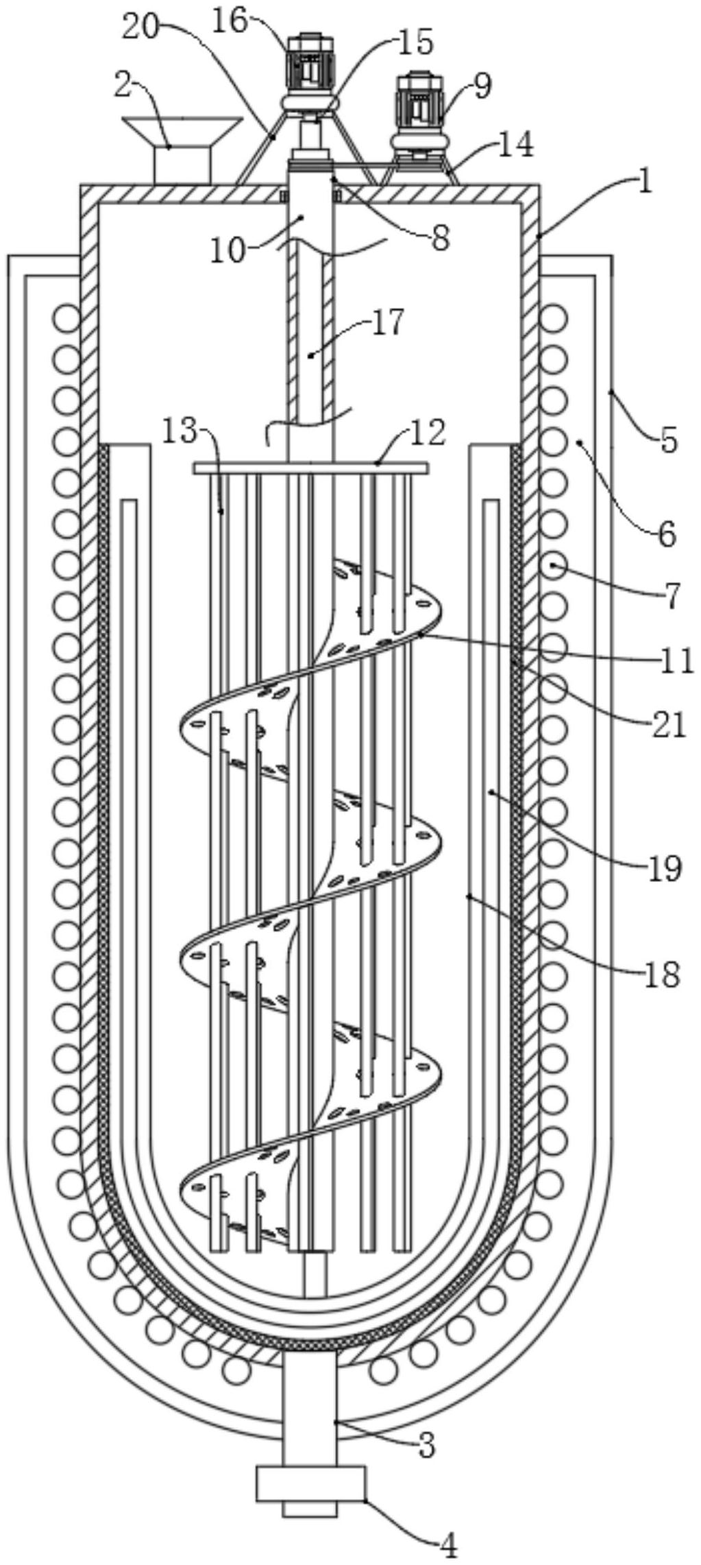 本实用新型公开了一种蜂蜜制备加工用融化装置,包括融化罐和搅拌组件,融化罐上设置有用于进料的进料口和用于出料的出料口,出料口上设置有出料阀门;融化罐外设置有隔热层,隔热层与融化罐内部形成一夹层,夹层内设置有缠绕在融化罐上的加热管,加热管与融化罐外壁贴合,夹层内填充有隔热材料;搅拌组件包括第一搅拌组件,第一搅拌组件包括电机、转轴、螺旋搅拌叶、连接盘和电加热杆,转轴转动安装在融化罐上,转轴下端延伸进融化罐内,螺旋搅拌叶设置在转轴上。本实用新型能够实现凝固蜂蜜的快速融化,并且能够实现对蜂蜜的搅拌。