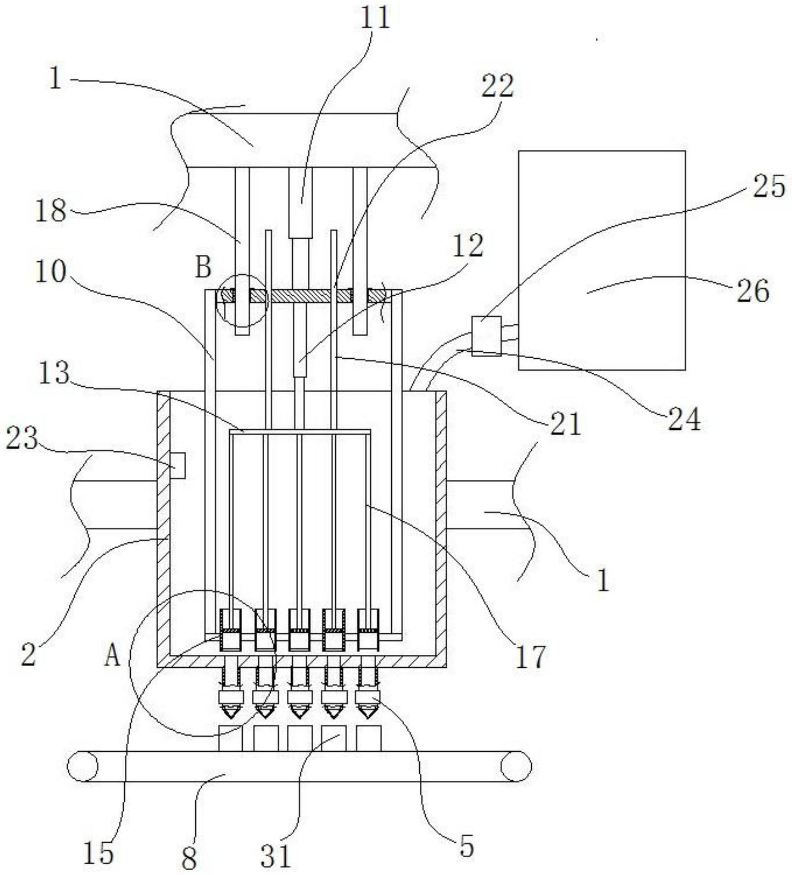 本实用新型公开了一种蜂蜜生产线上用蜂蜜灌装机,包括机架,机架上固定安装有存储罐,存储罐的底部上设置有若干呈阵列分布的出料孔,每一个出料孔均连接有一灌装管,灌装管上设置有一电磁阀,灌装管的端部设置受力后能够打开的橡胶膜瓣,不受力时,橡胶膜瓣呈封闭状态;存储罐内设置有底板,底板上设置有圆孔,每一个圆孔内均固定安装有一圆筒,圆筒的两端均延伸出底板,每一个圆筒均对应一个出料孔,每一个圆筒的下端均设置有缓冲垫;底板上连接有支架,支架通过一第一液压缸与机架连接。本实用新型在使用的时候具有灌装量误差小,灌装效率高的优点。