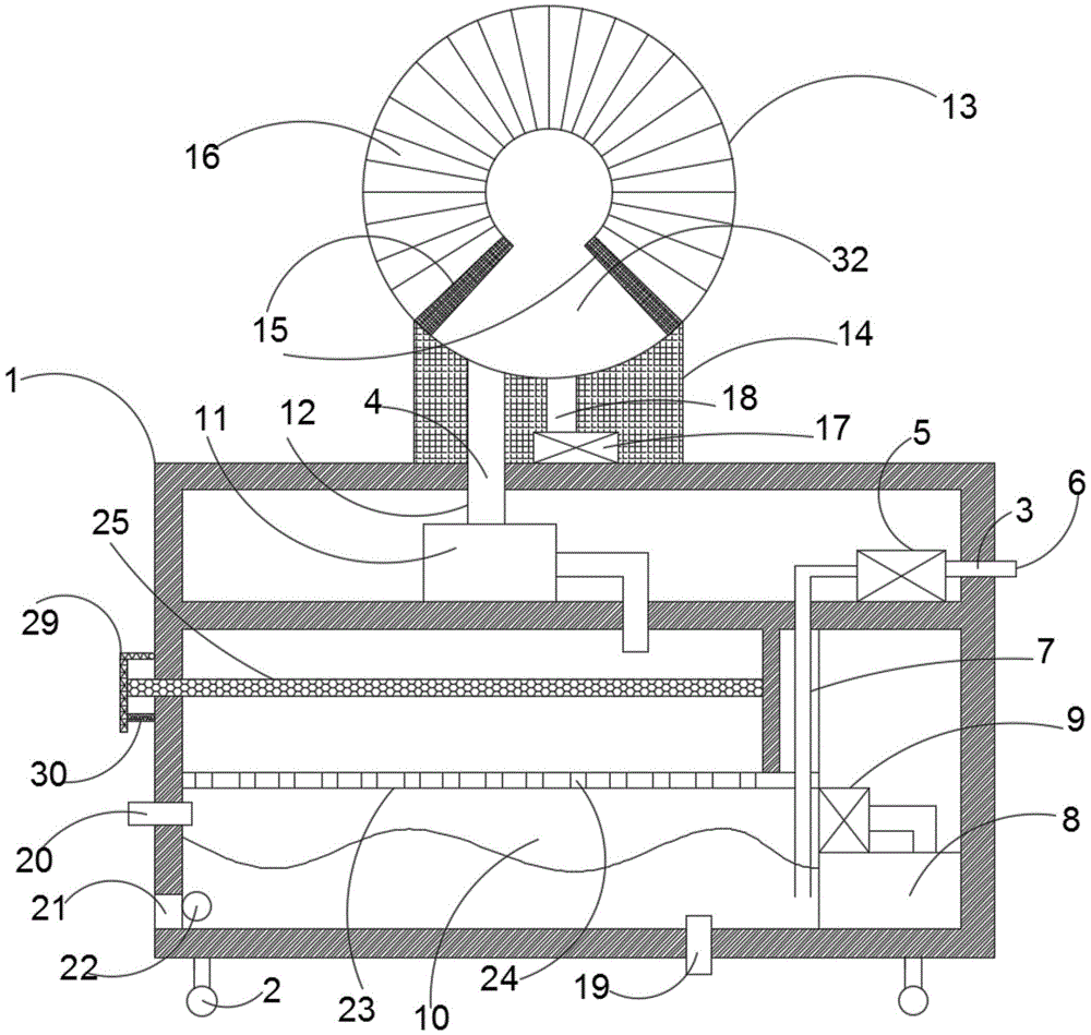 本实用新型提供一种室内移动式空气杀菌净化机,包括机主体、移动轮、进风口、出风口、抽风机、进风管、送风管、臭氧发生器、送风机、水溶液腔、增压泵、出风管和球体喷气装置,机主体下端安装有移动轮,进风管贯穿进风口伸入机主体与抽风机连接,水溶液腔填充有水溶液,送风管一端与抽风机连接,另一端伸入水溶液,送风机一端与臭氧发生器连接,另一端与水溶液腔连接,增压泵一端与水溶液腔连接,另一端与出风管连接,出风管贯穿出风口与球体喷气装置连接。本实用新型解决了现有的空气净化器的净化效果不理想,多为固定式,并不能随意移动;一般只能朝一个方向喷出,喷出角度也有限的问题。