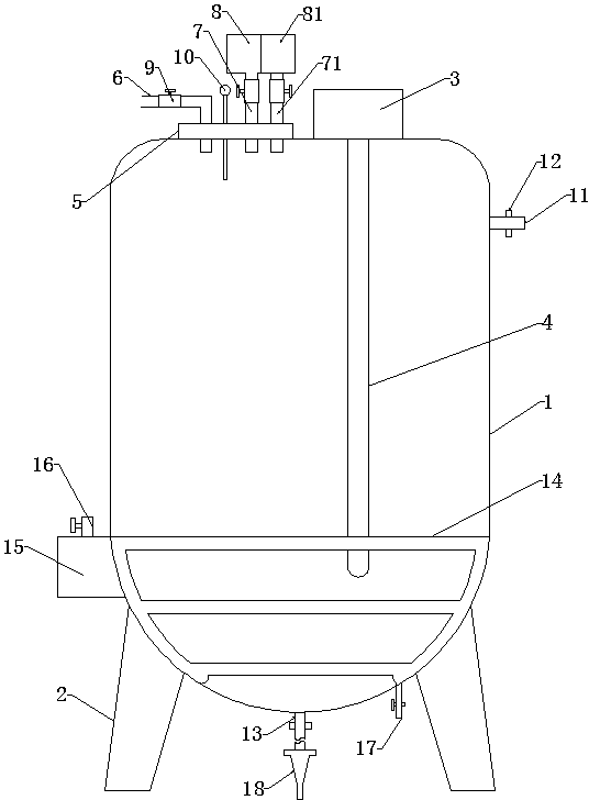 本实用新型涉及一种蜂蜜脱气及灌装装置,包括罐体和支撑脚,罐体顶部设置有震动机,罐体内设置有震动棒,震动棒上端与震动机连接,罐体上端还设置有密封盖,密封盖上设置有进料管,密封盖上设置有抽气管和进气管,抽气管上设置有抽气机,抽气管上设置有灌气泵,密封盖上中部设置有气压表,气压表一端设置在罐体内,罐体上端一侧设置有排水管。本实用新型的有益效果是:通过循环热水器和热水管的设置将水循环加热后灌入热水管内,通过热传递的作用使蜂蜜慢慢融化,取用蜂蜜方便,简单;通过灌气泵和灌装头的设置气压的作用将蜂蜜由出料管压出,能够加快灌装速度,且灌装效果好。