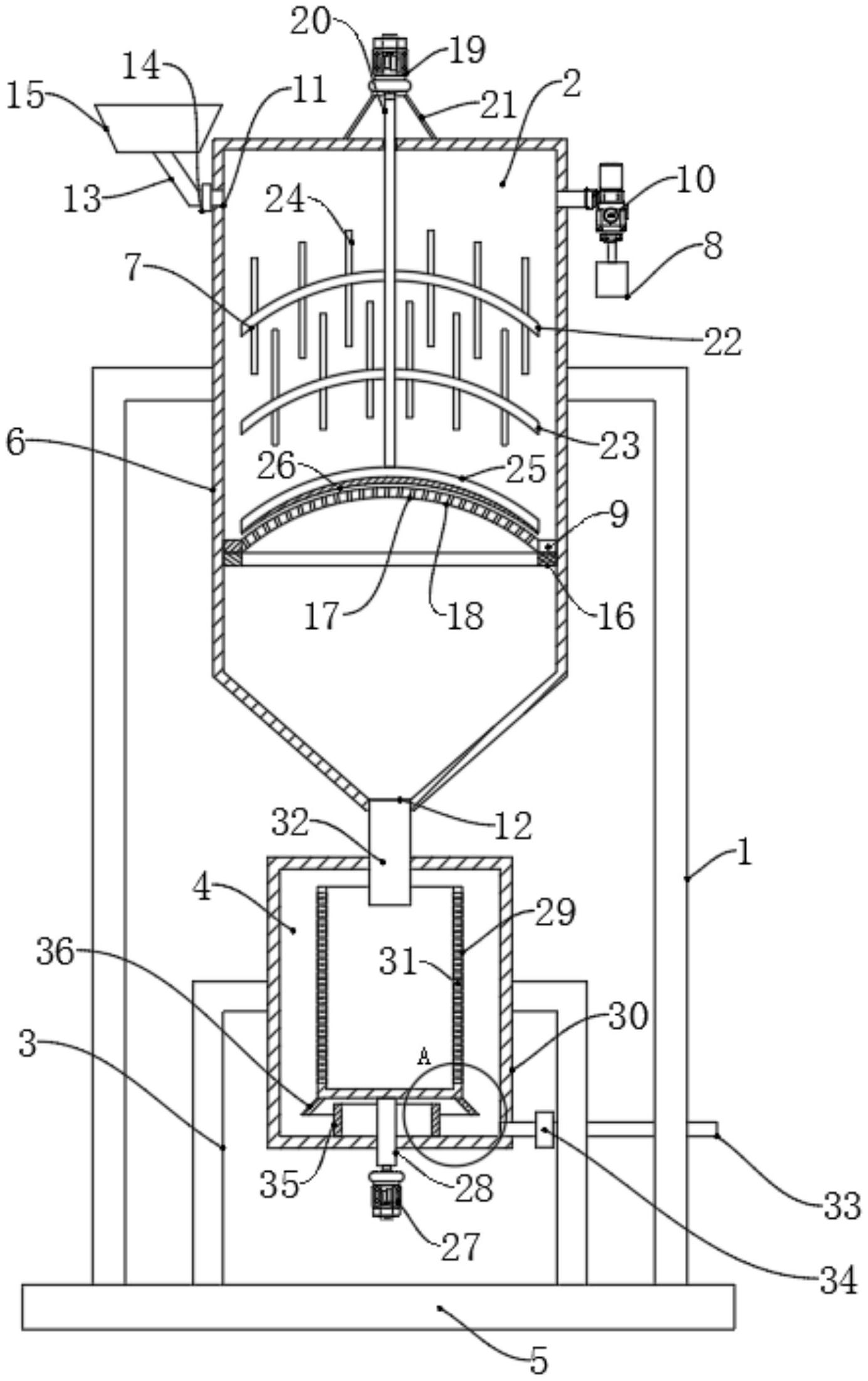本实用新型公开了一种蜂蜜加工用过滤装置,包括安装在第一支架上的第一过滤组件,位于第一过滤组件下方安装在第二支架上的第二过滤组件,第一支架及第二支架安装在底座上;第一过滤组件与第二过滤组件相互连接;第一过滤组件包括过滤筒、搅拌装置、空气净化器、过滤板和空气增压机,过滤筒下端呈倒圆台状结构,过滤筒上设置有进料口和出料口,进料口连接有进料管,进料管上设置有进料阀,在进料管上设置有进料漏斗,搅拌装置安装在过滤筒内,搅拌装置用于搅拌及加热物料;空气增压机与过滤筒内部连通,空气增压机与空气净化器连接。本实用新型具有过滤效果好,过滤速度快的优点。