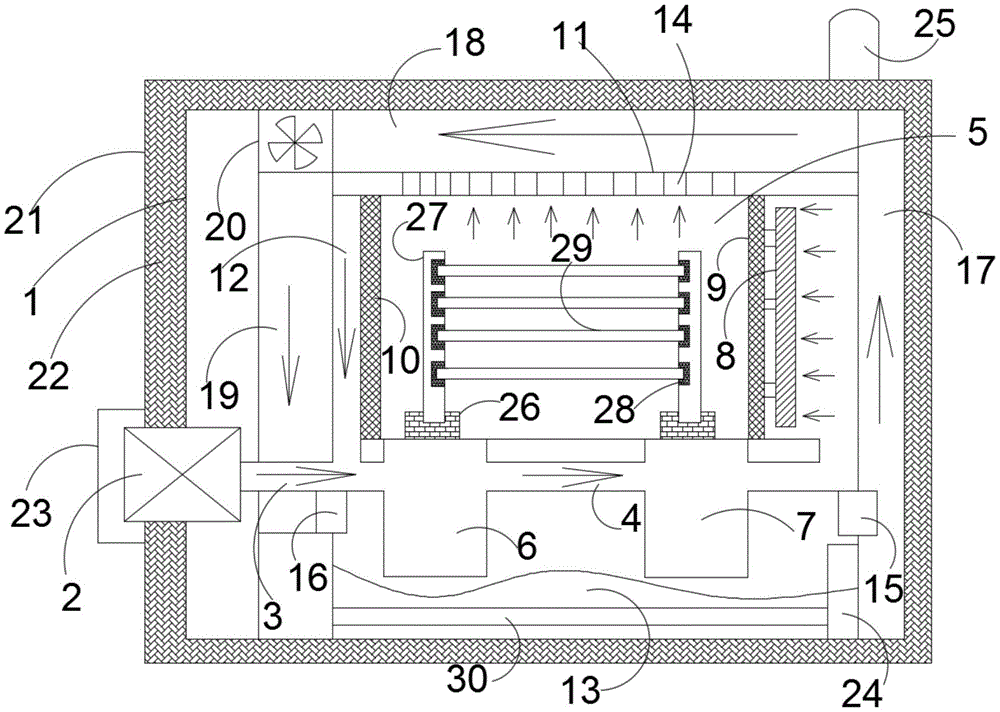 本实用新型提供一种热风循环烘箱,烘干柜下端安装有一号受热腔和二号受热腔,电风扇通过第一风管与一号受热腔连接,一号受热腔通过第二风管与二号受热腔连通,二号受热腔与烘干柜连通,烘干柜安装有一号导流板,一号导流板一侧安装有散热器,烘干柜远对面侧安装有二号导流板,二号导流板一侧形成回风通道,回风通道与第一风管连通,烘干柜通过疏气板与蒸汽循环通道连接,箱体内底部设置有蒸汽发生腔,蒸汽循环通道两端分别与蒸汽发生腔的两侧的通气孔连接,蒸汽循环通道和蒸汽发生腔形成环绕着烘干柜的加热保温腔。本实用新型解决了现有的热风循环烘箱保温性能较差,烘干过程中产生的水气不能及时排出而导致烘干效率较为低下的问题。