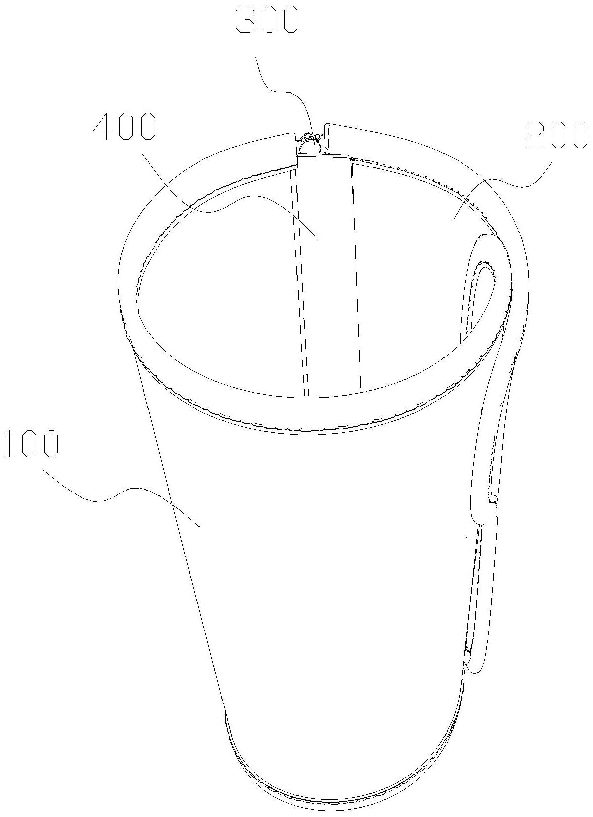 本实用新型公开了一种空气波按摩腿套,包括由气囊片和连接片,所述气囊片的一边和连接片的一边通过拉链连接,所述连接片的另一边通过魔术贴粘贴在气囊片的外表面形成腿套;所述气囊片和连接片位于拉链连接处设置有一拉链盖片,所述拉链盖片从腿套的内表面覆盖所述拉链。本实用新型具有能避免腿毛卡入拉链内的优点。
