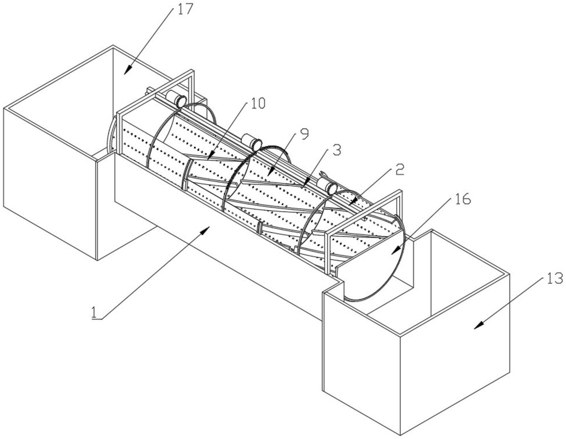 本实用新型公开了香辛料自动清洗装置,包括箱体及用于香辛料清洗的清洁部件,所述清洁部件包括设于箱体一侧的固定架、设于固定架底部的喷液管、多个设于固定架一侧的电机、设于电机一侧的转动轮、设于转动轮一侧的齿轮部、设于齿轮部一侧的从动环、设于从动环一侧的齿槽部、设于从动环一侧的清洁板、多个设于清洁板一侧的弧形板,本实用新型通过设置箱体、固定架、喷液管、电机、转动轮、齿轮部、从动轮、齿槽部、清洁板和弧形板,解决了现有的香辛料清洗装置在清洗时不能够对香辛料进行翻转清洗,清洗效果不好的问题。