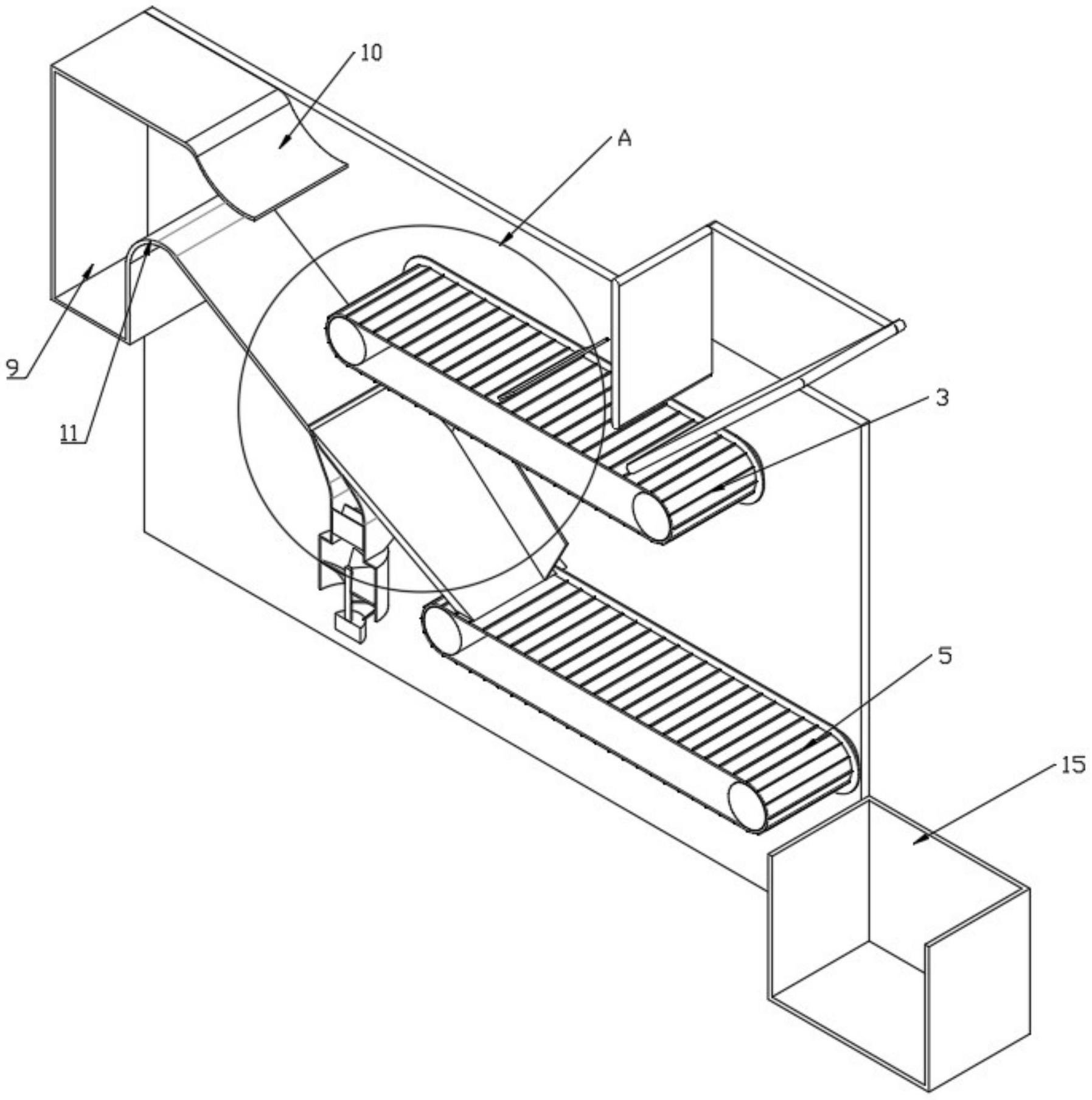 本实用新型公开了连续化香辛料冷却分离装置,包括本体及用于连续冷却香辛料的冷却部件,所述冷却部件包括设于本体一侧的进料口、设于进料口一侧的第一传送带、设于第一传送带一侧的导料板、设于导料板一侧的第二传送带、设于导料板一侧的通风口、设于通风口一侧的导风管、设于导风管一侧的风机及用于杂质收集的收集部件,本实用新型通过设置本体、进料口、第一传送带、导料板、第二传送带、通风口、导风管、风机及收集部件,解决了现有的香辛料冷却分离装置不方便对香辛料进行连续的冷却,且不方便将香辛料中的杂质进行分离,不便于使用的问题。