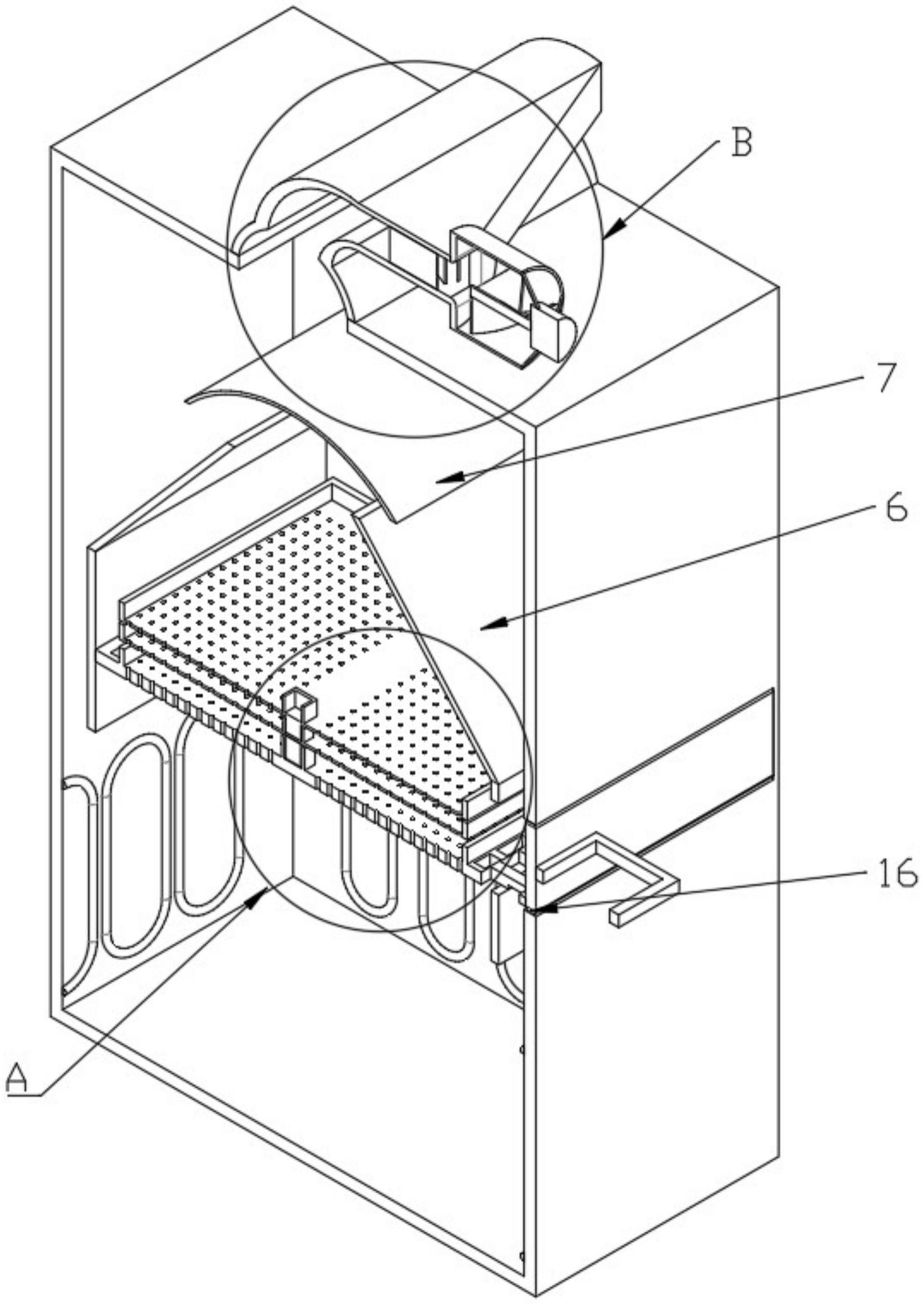 本实用新型公开了香辛料颗粒蒸汽灭菌装置,包括箱体及用于防止水滴滴落到颗粒香辛料上的导流部件,所述导流部件包括多个设于箱体一侧的加热管、多个设于加热管一侧的放料板、多个设于放料板中部上的通气孔、多个设于通气孔两侧的通水孔、设于通水孔一侧的导流板、设于导流板一侧的弧形板及设于弧形板一侧的通气口,本实用新型通过设置箱体、加热管、放料板、通气孔、通水孔、导流板、弧形板和通气口,解决了现有的香辛料颗粒蒸汽灭菌装置不能够对水蒸气进行二次利用,且部分水蒸汽凝结成的水珠会滴落到颗粒香辛料上的问题。