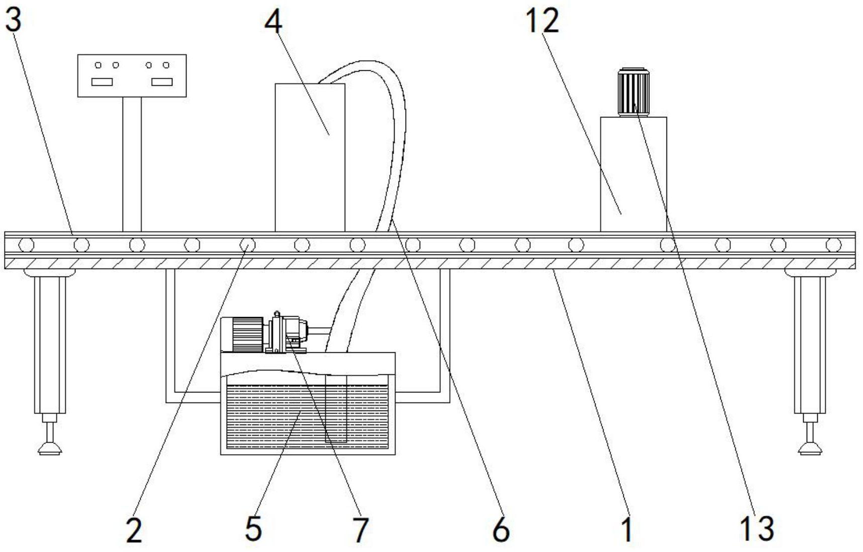 本实用新型涉及蒜蓉辣酱生产技术领域,且公开了一种蒜蓉辣酱灌装封口设备,包括输送台,所述输送台的内部转动连接有输送辊轴,所述输送辊轴的外侧传动连接有传送带,所述输送台的顶部固定连接有灌装处理箱,所述输送台的底部固定连接有蒜蓉辣酱储存箱,所述蒜蓉辣酱储存箱的内部固定连接有输送管,所述蒜蓉辣酱储存箱的顶部固定连接有增压泵,所述灌装处理箱的内顶壁固定连接有下料喷头,所述灌装处理箱的后侧壁固定连接有第一伸缩推杆,所述第一伸缩推杆正面的一端固定连接有第一限位块。该蒜蓉辣酱灌装封口设备,通过将机械化运输、灌装和封口相结合,取代人工灌装和封口,减轻了人工劳动强度,有效的提高了蒜蓉辣椒酱的生产效率。