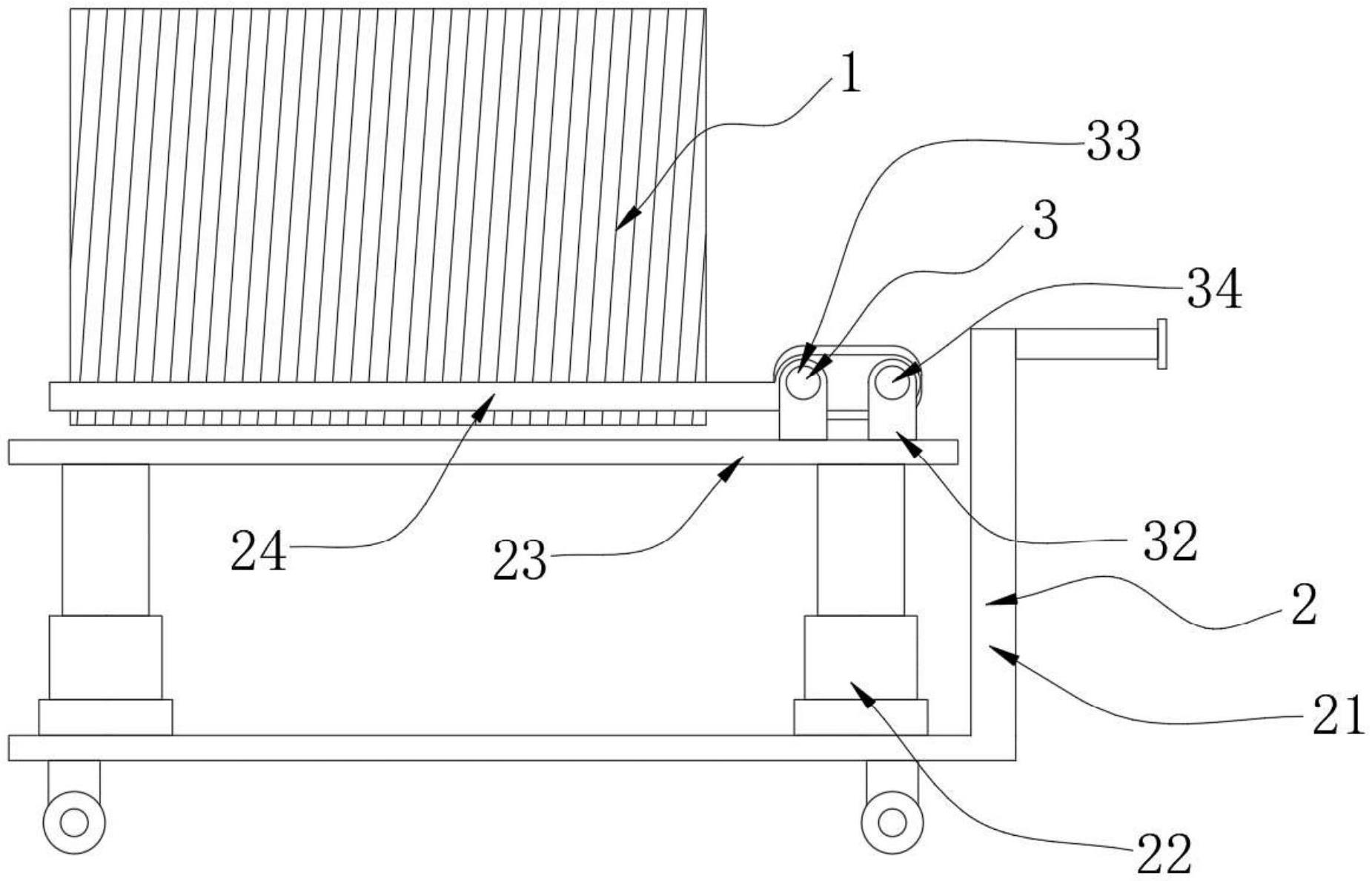 本实用新型属于钢绞线制造技术领域,尤其为一种钢绞线排线调整装置,包括线辊,还包括设置在线辊一侧的抬升组件,所述抬升组件包括底板、液压顶、托板和托条,所述底板的表面与所述液压顶的一端固定连接,所述液压顶的另一端与所述托板靠近所述底板一侧的表面固定连接,且所述托板远离所述液压顶一侧的表面还设置有所述托条,本装置通过抬升组件的工作,可以有效的通过液压顶的运作使线辊有效的抬起,有效的降低了人工的消耗,通过调节组件的工作,可以使托条能够根据线辊的不同尺寸来调整托条的间距,从而使调节组件在抬升组件的配合能够对线辊进行顺利的的位置调整。