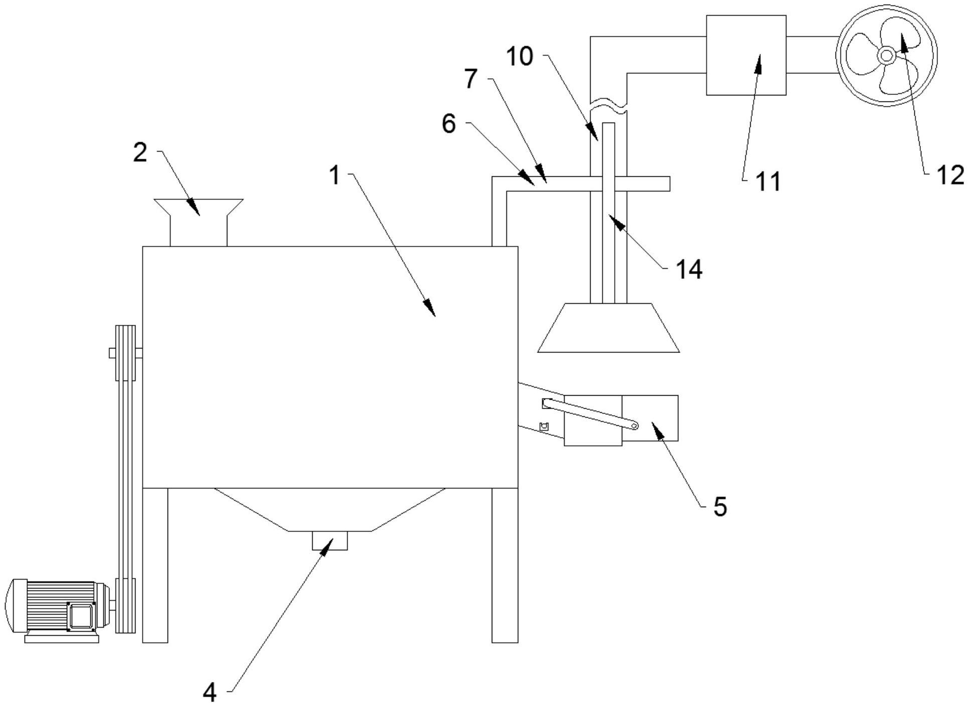 本实用新型涉及燕麦去皮机技术领域,具体为一种软毛刷式裸燕麦去皮机,包括有去皮机本体,去皮机本体设有接料组件和吸风组件,吸风组件包括有连接架,连接架连接有升降组件,升降组件连接有吸风罩,吸风罩的顶部连接有软管,软管连接有布袋除尘器,布袋除尘器连接有风机,布升降组件包括有棘条,棘条固定在吸风罩的顶部,连接架开设有通槽,棘条连接在通槽内部,连接架设有连接座,连接座设有转杆,转杆外壁设有止回块,转杆外壁设有扭转弹簧。通过风机产生负压,将燕麦皮吸入到布袋除尘器中,从而防止粉碎后的燕麦皮飘散在空中,导致车间内空气粉尘较多的问题。而且,可升降的吸风罩,可以防止在更换接料容器时,避免头部与吸风罩碰撞的问题。