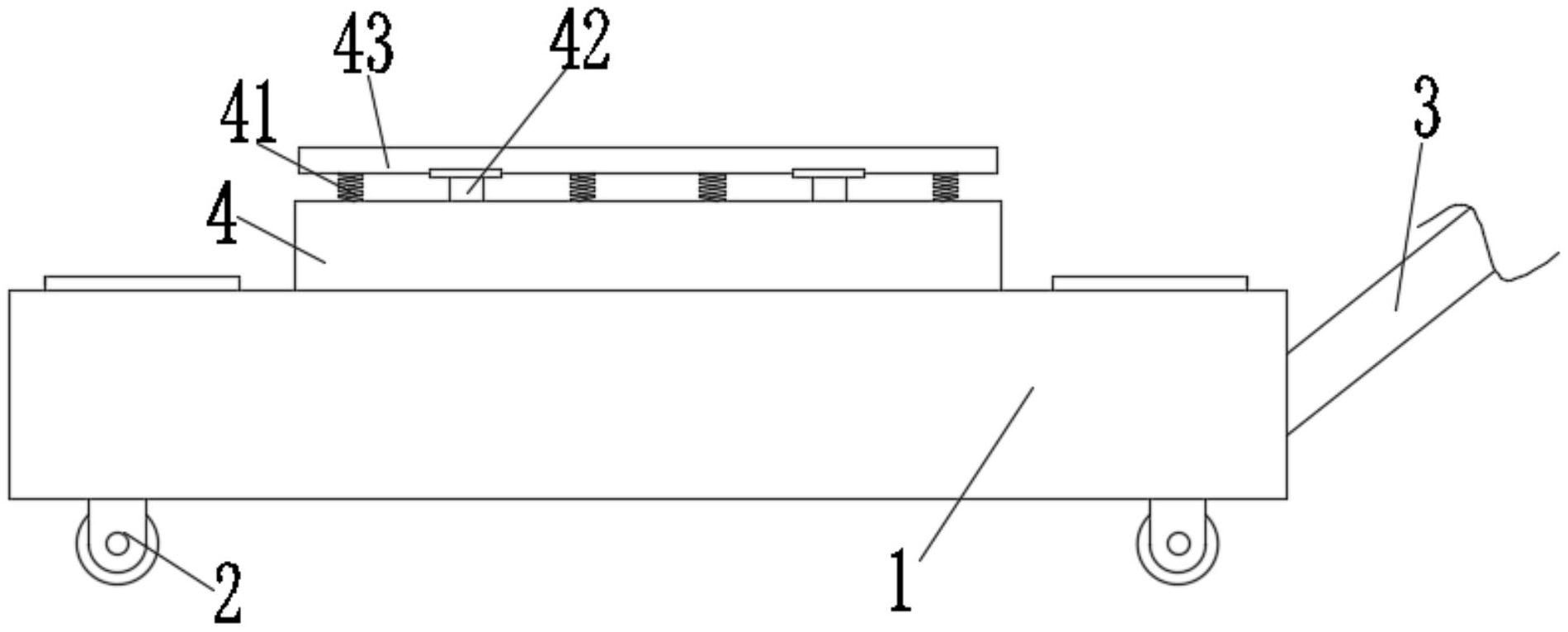 本实用新型公开了一种家具智能制造用运输装置,包括固定块一,所述固定块一底部均分别设置有万向轮,所述固定块一右侧固定安装有推杆,所述固定块一顶部设置有固定块二,所述固定块二顶部固定安装有弹簧,所述弹簧数量为四个,所述固定块二顶部左右端固定安装有支撑杆,两个所述支撑杆设置在四个弹簧相互靠近的一侧,两个所述支撑杆顶部固定安装有压板,本实用新型通过设置固定块三,只有在压板顶部都有家具时,固定块三才会气体被顶出,转动螺纹杆右侧的把手对家具进行夹紧,通过设置磨砂块,可增加与家具之间的摩擦力一定程度上能提高夹紧的效果,通过设置弹簧,可在运输中产生晃动时对家具进行减震的效果。