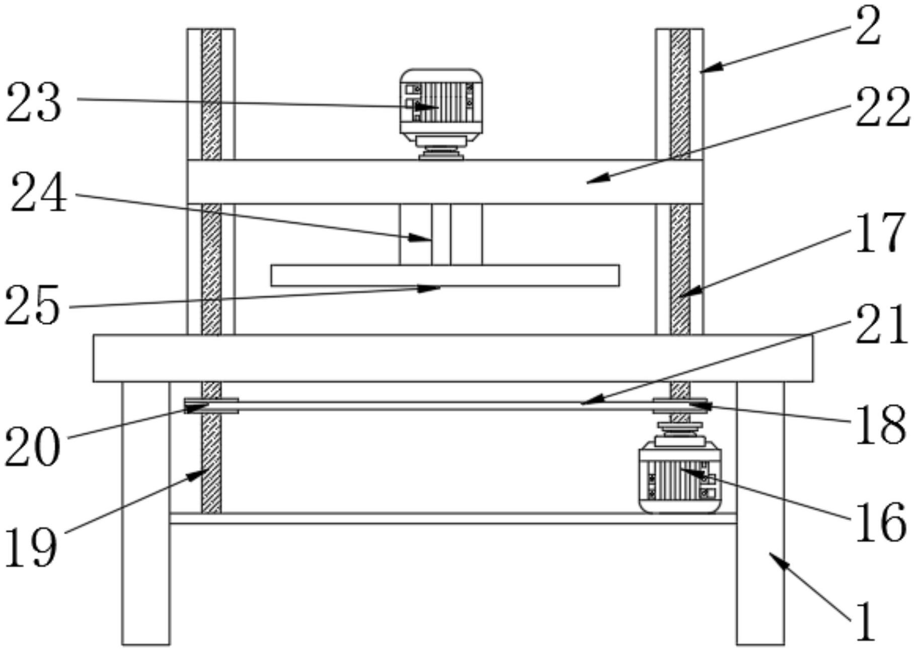 本实用新型涉及木材加工技术领域,且公开了一种用于板材加工的涂胶装置,包括装置底座,所述装置底座顶部的两侧均固定安装有支撑杆,所述装置底座内腔的底部固定安装有传动装置,所述传动装置包括一号电机,该用于板材加工的涂胶装置,通过一号电机转动带动一号转轴转动并带动一号主动轮转动,使用人员通过一号主动轮转动带动一号动力传送带转动并带动一号从动轮转动,再通过一号从动轮转动带动一号转动轴转动并带动对齿轮转动,使用人员通过对齿轮转动带动半齿轮转动并带动主齿轮转动,再通过主齿轮转动带动三号转动轴转动并带动凹型挡板转动,实现了板材的两面加工,提高了涂胶的效率。