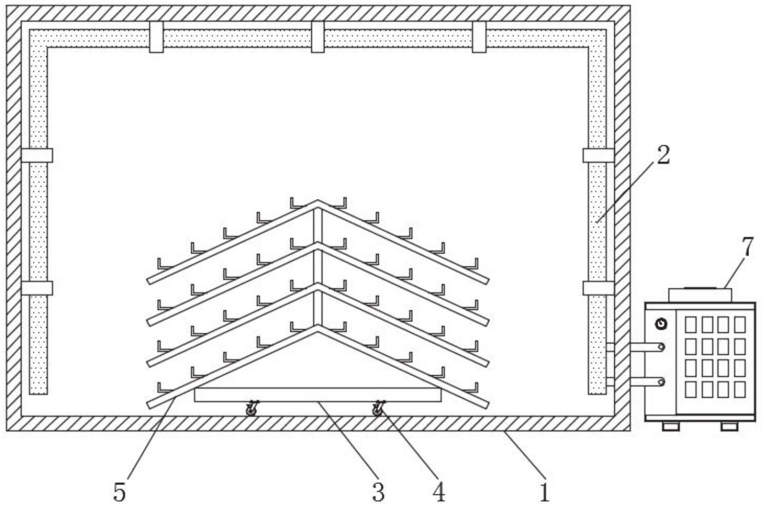 本实用新型公开了一种奶制品均匀烘干杀菌一体化烘烤房,包括烘烤房本体,所述烘烤房本体内固定设有热管组,所述烘烤房本体内设有底板,所述底板底部通过螺栓固定设有四组自锁万向轮,底板顶部固定连接有料车板,料车板顶部固定连接有放置板,烘烤房本体外部固定设有空气源热泵。该奶制品均匀烘干杀菌一体化烘烤房是通过空气源热泵产生热量,并将热量传递多组热管组内,通过热管组上设有的散热孔将热量均匀分布到烘烤房内,通过设置放置板用于放置待烘干的奶制品,料车板结构可有效避免蒸汽汇聚滴落到奶制品上的问题,设置排湿风机有效抽出烘烤房本体内的蒸汽,该奶制品均匀烘干杀菌一体化烘烤房结构合理,有效提高奶制品烘干加工质量。