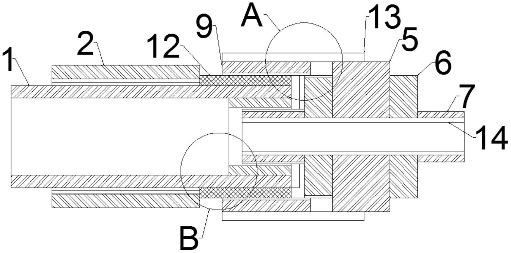 本实用新型公开了快捷改质与高效动力系统用软管,包括波纹管,所述波纹管上固定套接有橡胶套,所述橡胶套的内壁上固定套接有拉伸铜丝网套,所述波纹管上固定套接有固定铜丝网套,所述波纹管的内部固定套接有内螺纹圈,所述波纹管的末端安装有固定块,所述固定块的两侧对称安装有连接圈,所述连接圈的侧面安装有连接管,所述连接管的侧面开设有第三螺纹,所述连接管通过第三螺纹螺纹套接在内螺纹圈内。本实用新型软管的柔韧性更好,且软管连接时更加牢固稳定。