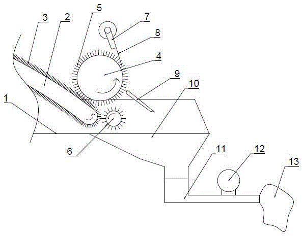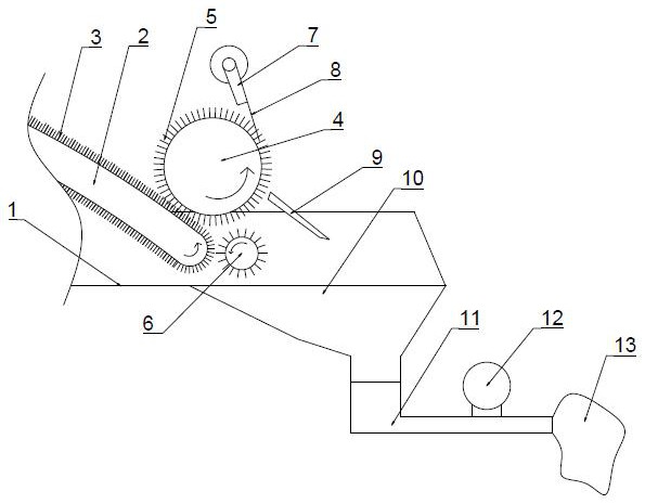 本实用新型涉及梳棉机技术领域,尤其是一种梳棉机盖板的清理装置,包括梳棉机机架及设置在梳棉机机架上的盖板,在盖板一端端部的上方设置有针布滚筒,针布滚筒的周向表面间隔阵列有钢针,在针布滚筒下方的梳棉机机架上设置有钢丝毛刷,在针布滚筒上方的梳棉机机架上设置有一块针板,针板上设置有一排清洁针,在钢丝毛刷和针布滚筒所对应位置下方的梳棉机机架上设置集尘腔,集尘腔的底部设置有集尘管道,集尘管道的端部设置有集尘袋。本实用新型所得到的一种梳棉机盖板的清理装置,其通过合理的结构设计,能对盖板上的盖板花及盖板针之间的短纤维进行彻底清理,清理效果好,而且设备运行稳定,使用寿命长。