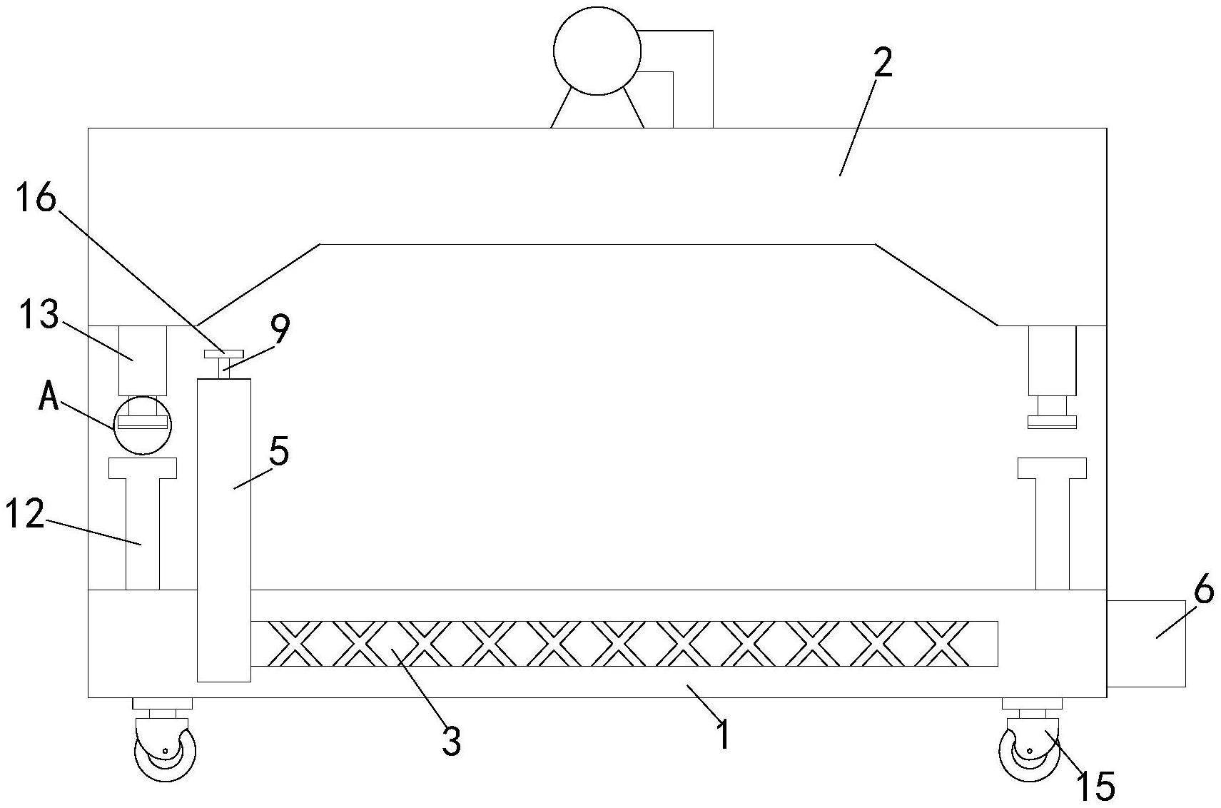 本实用新型涉及烘干定型机技术领域,具体为一种烘干定型机的烘箱结构,包括底板和烘箱本体,烘箱本体安装在底板上,底板上开设有第一滑槽,第一滑槽内转动连接有往复丝杠,往复丝杠上配合连接有第一滑块,第一滑块上固定连接有连接板,底板上安装有电机,电机的输出端贯穿底板并与往复丝杠的一端固定连接,连接板上开设有第二滑槽,第二滑槽内滑动连接有两个第二滑块,并且第二滑槽内转动连接有反向螺杆,反向螺杆与两个第二滑块均通过螺纹连接,并且反向螺杆的一端固定连接有转动轴,转动轴的一端贯穿连接板并延伸至外部,具有可以便于使用者清理织物上的线头,减少人工工作量,省时省力,使用便捷性较高的效果。