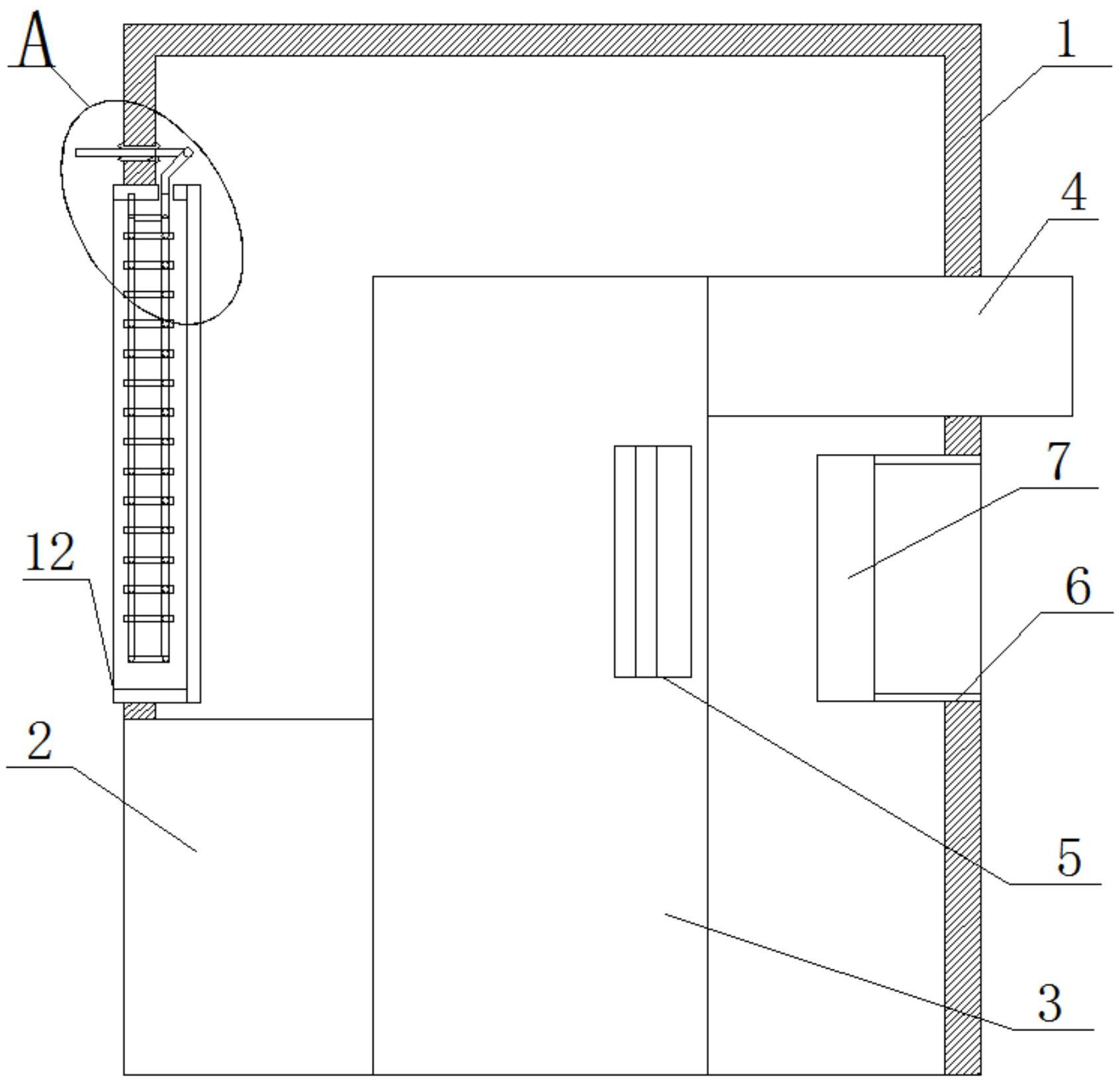本实用新型属于机器加工领域,尤其是一种透气保暖气凝胶复合面料的生产设备,包括外壳,所述外壳的一侧上固定安装有通风管,所述通风管的一端位于外壳外,另一端延伸至外壳内并开设有螺纹,通风管开设有螺纹的一端上套接有扭盖,扭盖内壁上活动安装有支架,支架靠近通风管的一侧固定安装有排气扇,且排气扇位于通风管内,扭盖和支架通过螺纹可以轻松的从通风管上取下,方便排气扇的清理。本实用新型结构简单,使用方便,提高了升温设备的工作效率,满足了人们的使用需求。