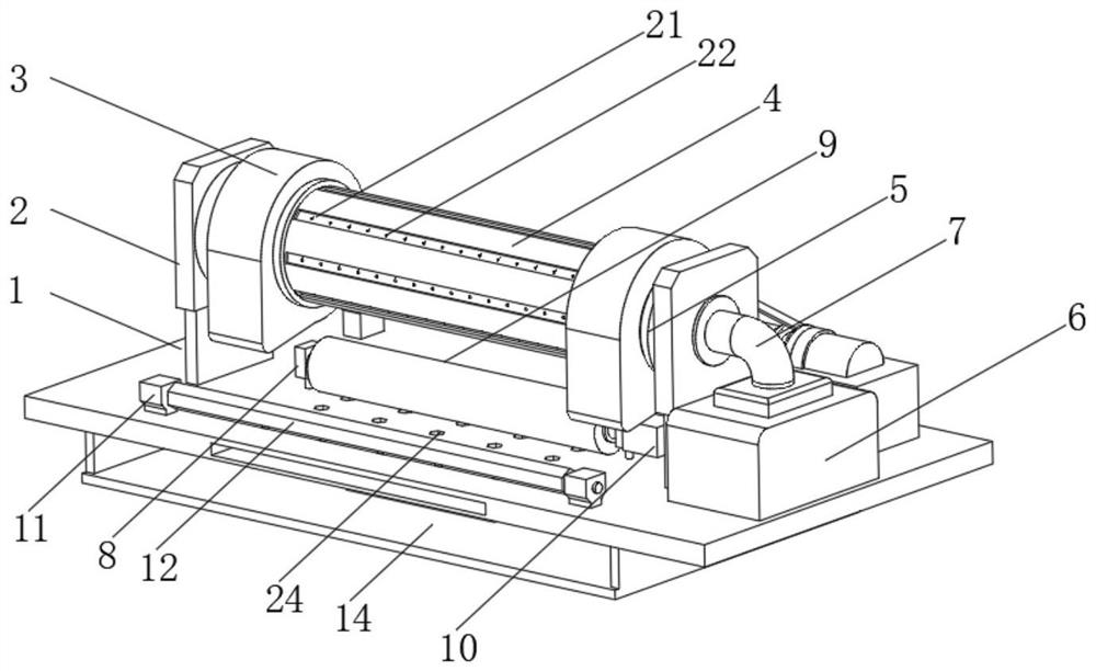 本发明公开了一种聚对苯二甲酰对苯二胺织物防静电屏蔽处理装置,包括底座,所述底座顶部两侧固定连接有边侧架,所述边侧架内侧安装有高温压力机构,所述高温压力机构中部安装有转动轴,所述高温压力机构之间安装有滚筒喷涂件,所述底座上方两侧设置有滚筒机架,所述滚筒机架之间安装有下位滚筒,所述底座顶部前侧固定连接有刮刀柱安装架,所述刮刀柱安装架之间安装有转换六棱柱,本发明涉及纺织物处理技术领域,本发明提出一种聚对苯二甲酰对苯二胺织物防静电屏蔽处理装置,解决了聚对苯二甲酰对苯二胺织物没有良好的防静电屏蔽的功能,现有的防静电屏蔽处理方式和方法也不适用于聚对苯二甲酰对苯二胺织物的防静电处理的问题。