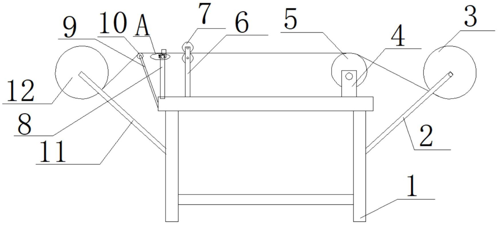 本实用新型属于斜纹面料生产用裁剪技术领域,尤其是一种斜纹面料生产用裁剪装置,包括工作台,所述工作台两侧均固定安装有第一支撑架的一端,第一支撑架为倾斜设置,两个第一支撑架的另一端转动安装有同一个第一转轮,工作台顶部一侧固定安装有两个第二支撑架,两个第二支撑架之间转动安装有同一个第二转轮,工作台的另一侧设置有裁剪机构,所述裁剪机构包括固定安装在工作台顶侧的两个第三支撑架,且两个第三支撑架之间转动安装有两个第三转轮。本实用新型在工作台上设置有可移动的刀片,随时调整位置,可以极大的提升工作效率。