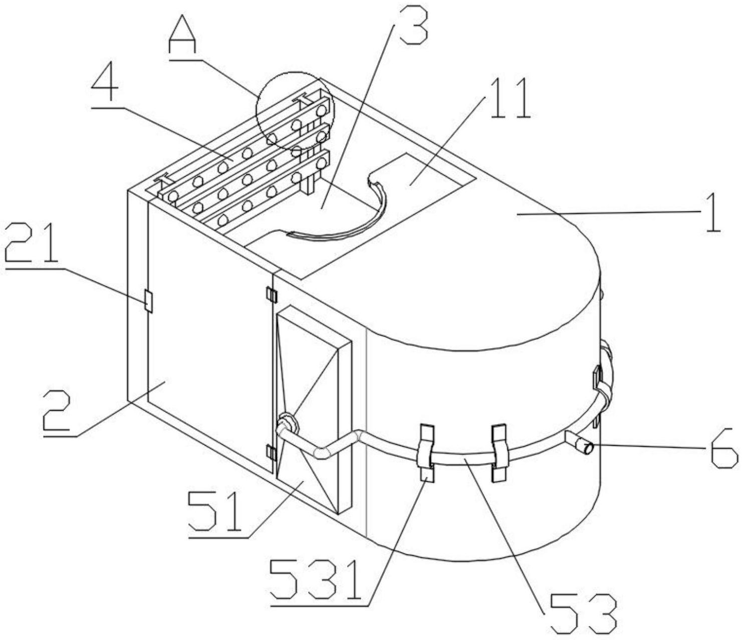 本实用新型公开了一种远红外半身桑拿舱,包括:仓体,用于承载使用者,仓体内部中空,且顶部设有开口,开口处设置有用于推拉的推板;舱门,舱门铰接于仓体侧边;座椅,座椅设置于仓体开口处的底部;按摩机构,按摩机构设置于仓体内壁上;缓流机构,缓流机构为两个,且分别对称设置于仓体的两个侧边上,每个缓流机构还包括:缓流腔,缓流腔内部中空,且缓流腔连通于仓体侧边,缓流腔靠近仓体的一侧开设有第一通孔,缓流腔远离仓体的一侧为漏斗状;隔板,隔板设置于缓流腔内,且隔板上开设有第二通孔;连接管,连接管连通缓流腔,并沿仓体外壁固定;总管,总管的一端连通两个缓流机构的连接管,总管的另一端连接蒸汽发生机构。