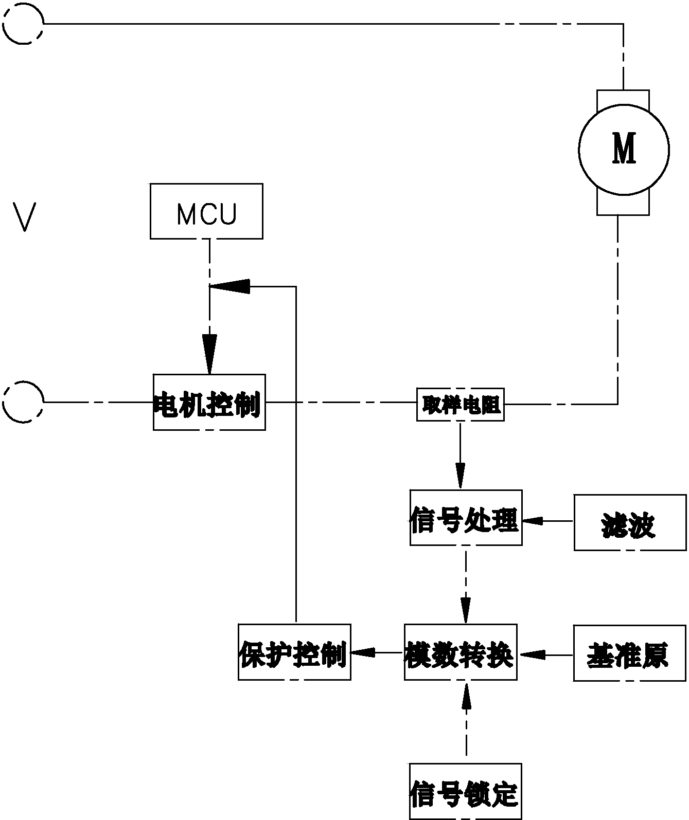 一种电机过流或堵转的纯硬件保护装置及其电动晾衣架,该装置中取样和转换模块将电流转换为电压信号并将该电压信号传送至信号处理模块;信号处理模块将采集到的电压信号进行放大并将放大后的电压信号传送至模数转换模块;模数转换模块将放大处理后的电压模拟信号进行模数转换成电压数字信号并将该数字信号传送至中心控制模块;中心控制模块通过数字信号之高低电平以控制继电器常开触点之通断进而控制电机之持续或停止转动。它具有如下优点:电机过流保护点精度非常高,而且可靠;且,该装置可以采用更低阻值的取样电阻,减少电阻的发热量,减少温漂、提高可靠性。