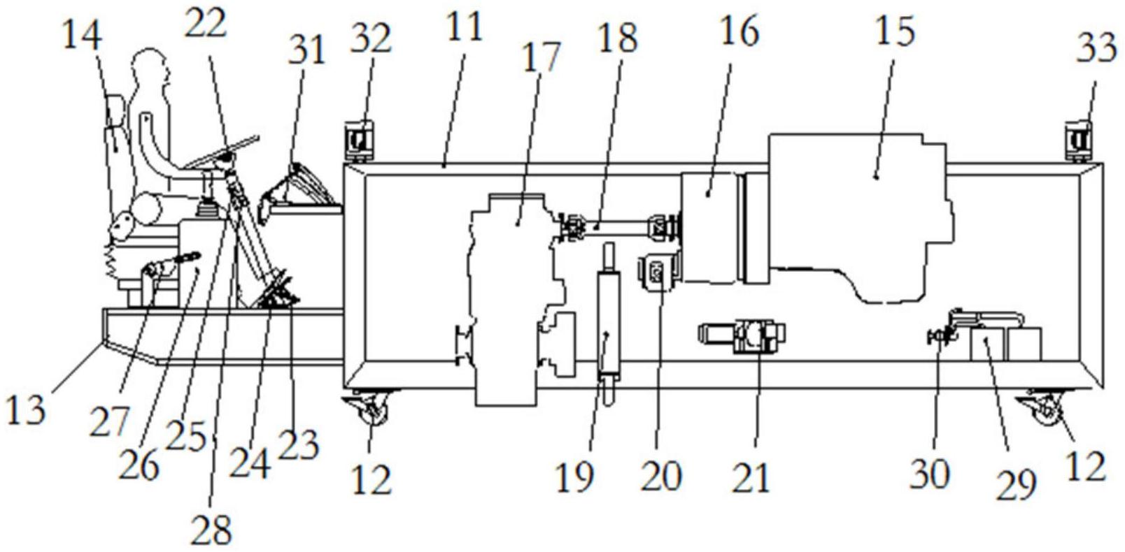 本实用新型涉及轮式工程装备教学设备领域,特别是涉及到了一种工程装备教学装置。该工程装备教学装置包括机架,所述机架上设有动力传动装置、液压组件、电器组件和驾驶操纵组件,所述机架为开放式机架并且设有驾驶平台,所述驾驶平台上设有驾驶座椅,所述动力传动装置包括发动机、变速箱、变矩器及传动轴,所述液压组件包括与所述变矩器连接的液压泵以及与所述液压泵连接的作业油缸,所述电器组件包括仪表台及仪表台上所设的仪表,所述驾驶操纵组件包括设于所述驾驶平台的转向器、油门踏板、制动踏板、变速操纵手柄、液压操纵手柄和手动制动手柄。该装置通过模拟实车作业的动作、检测的各个状态,可以让学员体验实车真实状态,优化教学效果。