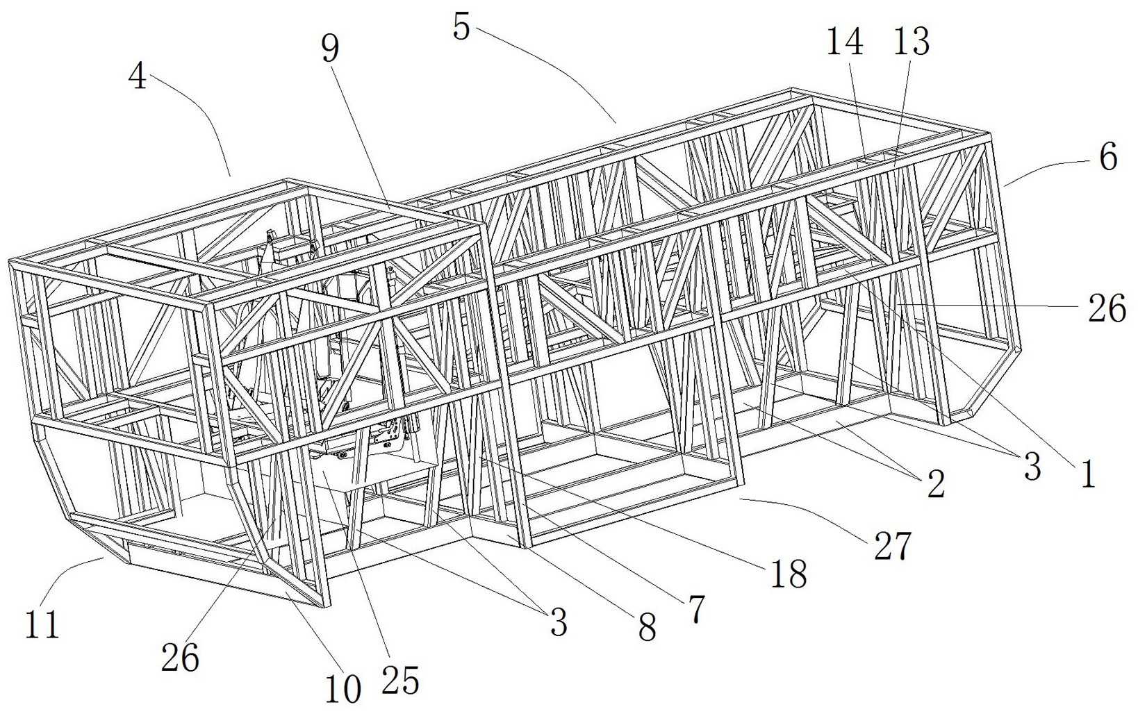 本发明涉及一种轮足复合装备及其车体,车体包括上纵梁和下纵梁,上、下纵梁均沿左右方向对称排布有两个,上纵梁位于下纵梁的外侧,所述上纵梁上设有用于安装腿足的腿足安装架;车体还包括斜立柱,斜立柱包括端部斜立柱和悬架斜立柱,端部斜立柱连接在上纵梁和下纵梁的两端之间,同一侧的端部斜立柱、上纵梁和下纵梁之间围成封闭的环;所述悬架斜立柱用于安装悬架,同一侧的上纵梁、下纵梁及悬架斜立柱之间形成供悬架及悬架上的车轮内收的容纳空间;车体还包括端部横梁,端部横梁与同一层的纵梁之间围成封闭的环。容纳空间使得悬架和车轮能够内收,端部横梁、端部斜立柱与上纵梁、下纵梁之间围成了多个方向上的封闭环。