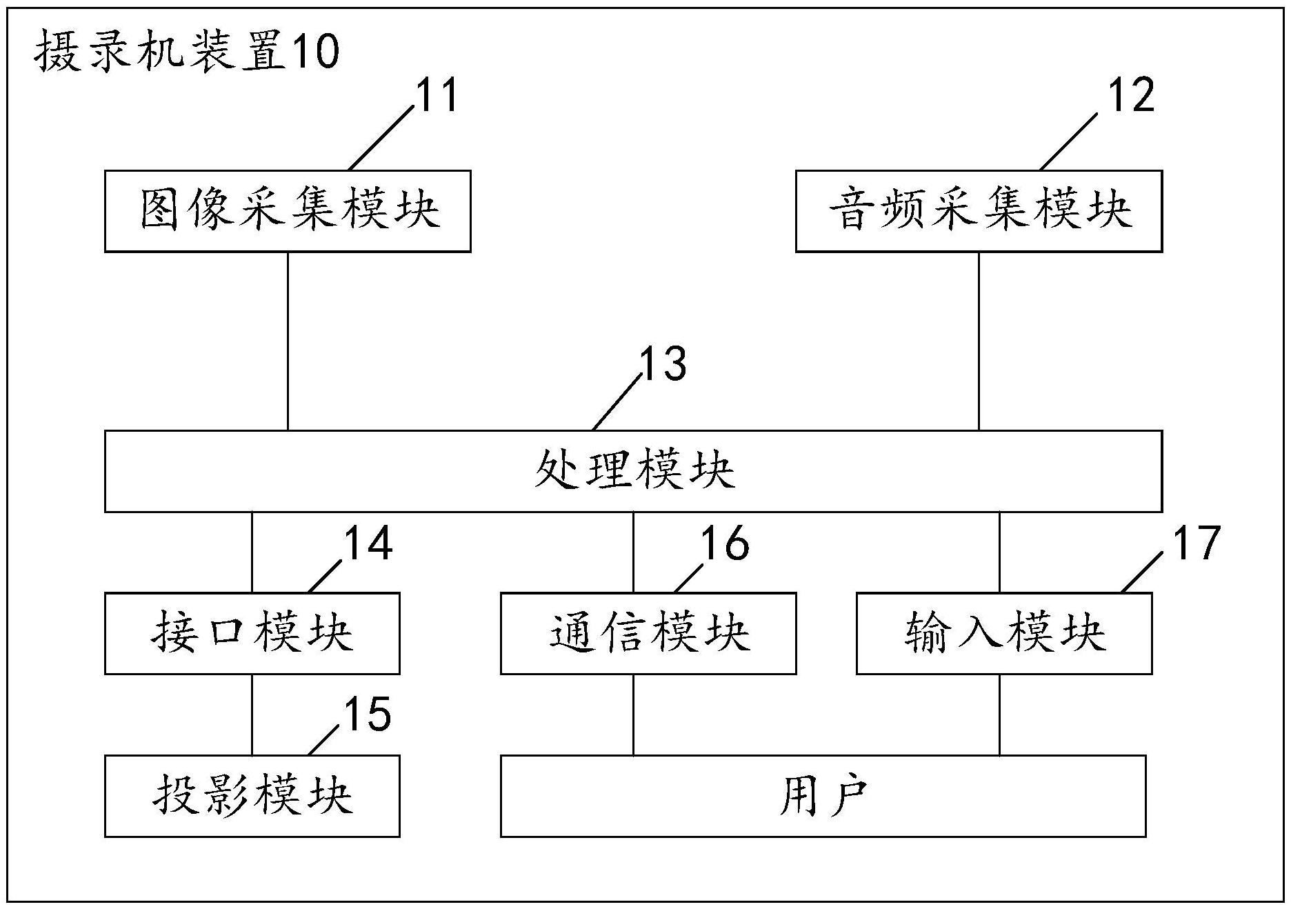 本申请实施例公开了一种带投影功能的摄录机装置。本申请实施例提供的一种带投影功能的摄录机装置,旨在通过处理模块获取图像帧和音频,并对两者数据进行处理,得到模拟视频数据,将模拟视频数据转换成数字视频数据后,将数字视频数据通过接口模块发送至投影模块,使得投影模块将数字视频数据转换成对应的光学图像视频,并投影至投影镜头对准的投影区域。通过上述技术手段,通过配置投影模块,使得摄录机装置包含投影功能,且投影模块内置与摄录机主体内部,只将投影镜头安装于摄录机主体表面,方便携带。