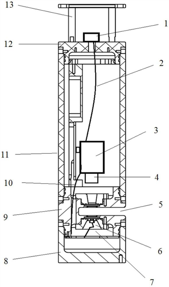 本实用新型公开了一种分布式功能水下荧光显微镜,包括上筒、下筒、中间筒、盖板、防水插头、把手、成像模组和激光模组;成像模组包括相机和照相物镜,安装于上筒内;盖板安装于上筒上端,盖板与上筒的内测通过密封圈防水;防水插头安装于盖板上,防水插头和相机通过数据电源线连接;激光模组包含光纤激光器和驱动器,安装于下筒内;中间筒中部部分镂空,镂空部分为样本空间,是照相物镜的成像范围;中间筒中心靠近样本空间的两端设置有透明防水玻璃窗,光线可穿透;上筒和下筒之间通过中间筒连接互通,内测通过密封圈防水,整个腔体保持密封。本实用新型水下作业深度可以达到500m;无需染色试剂,利用激光激发藻类产生荧光,可以拖曳作业。