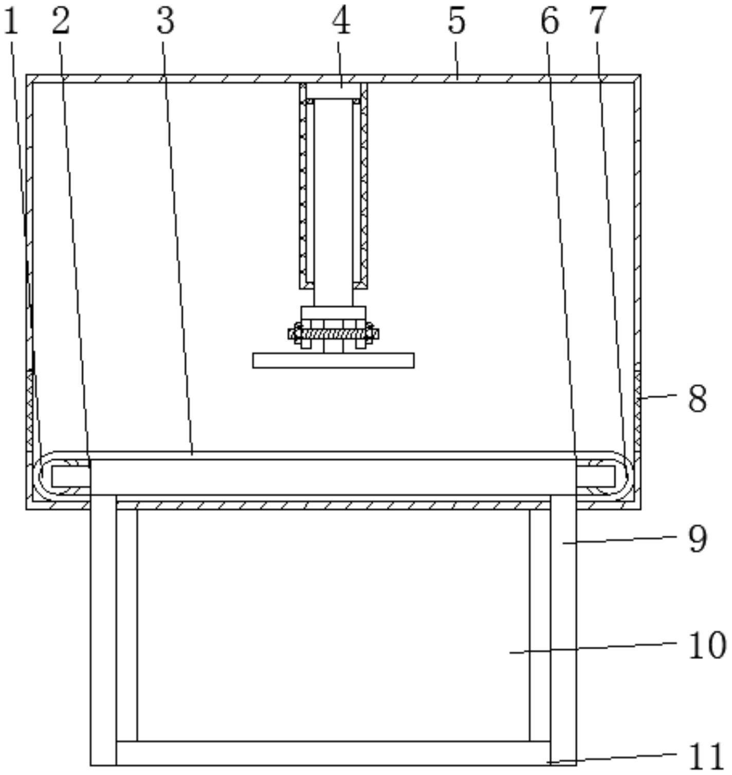 本实用新型公开了一种电蚊香片制造用新型切割装置,包括防护罩、存储箱、内杆、连接杆和切割台本体,所述切割台本体下表面焊接有支撑腿,且支撑腿内部焊接有固定板,所述存储箱焊接在固定板的上表面,所述切割台本体的一侧外端面焊接有固定杆,且固定杆内部转动连接有转动辊,所述切割台本体的一侧外端面焊接有支撑杆,且支撑杆的内部转动连接有支撑辊,所述防护罩套接在切割台本体的外表面,且防护罩的一侧外端面开设有通槽,所述防护罩的内部顶端焊接有外杆,且外杆的内部开设有限位槽,所述内杆的一侧外端面焊接有限位杆,且内杆活动插接在外杆的下表面。本实用新型便于切割蚊香片,且采用密闭设计,可以防止大量蚊香片对工人健康有损。