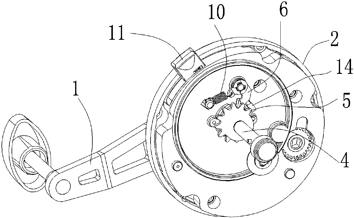 带声响装置的横式渔线轮,包括摇柄、端盖、绕线筒,摇柄安装在端盖上,摇柄与绕线筒之间通过传动机构连接,端盖内设有拨动齿轮以及声响拨片,拨动齿轮固定在绕线筒上从而随绕线筒的转动而转动;端盖上还设有控制机构,控制机构控制声响拨片靠近或远离拨动齿轮;当声响拨片靠近拨动齿轮时,拨动齿轮转动时触碰声响拨片从而发生声响;当声响拨片远离拨动齿轮时,拨动齿轮转动时不触碰声响拨片。本实用新型的声响装置安装在摇柄所在的端盖上,结构合理、操作简便。