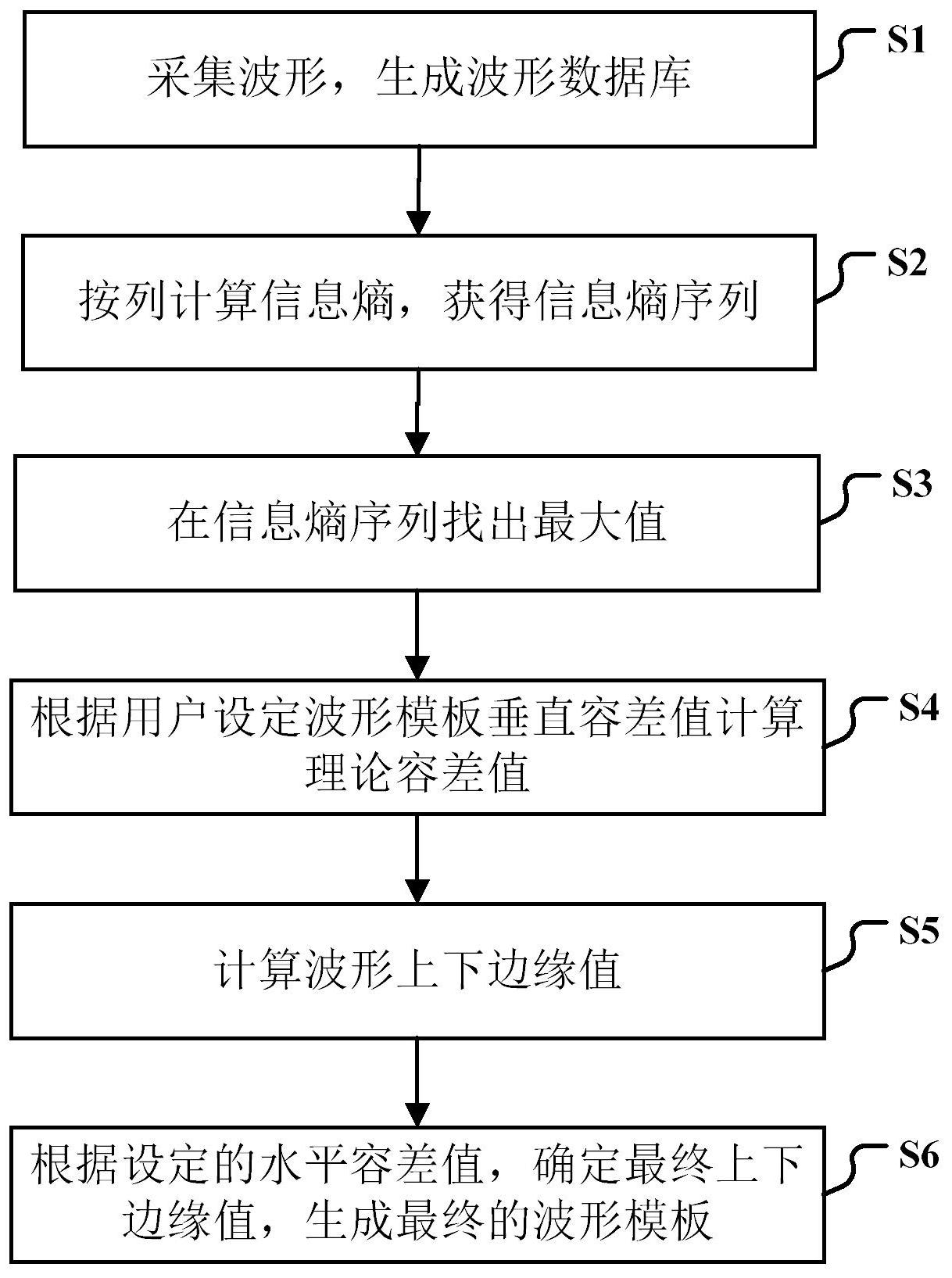 本发明公开了一种自适应的波形模板构造方法,其提出的自适应波形模板是对标准波形模板的扩充,基于波形数值概率计算每一列的信息熵,根据信息熵修正用户设定的波形模板垂直容差值gy得到每一列的理论容差值gi。这样可以根据具体的测试要求对水平和垂直方向上的容差值进行自定义,对不同的波形源以及容差值可以生成不同的波形模板,可以对这些波形模板进行保存并针对不同的测试波形进行使用,可以更好地适应各种信号的测试要求。