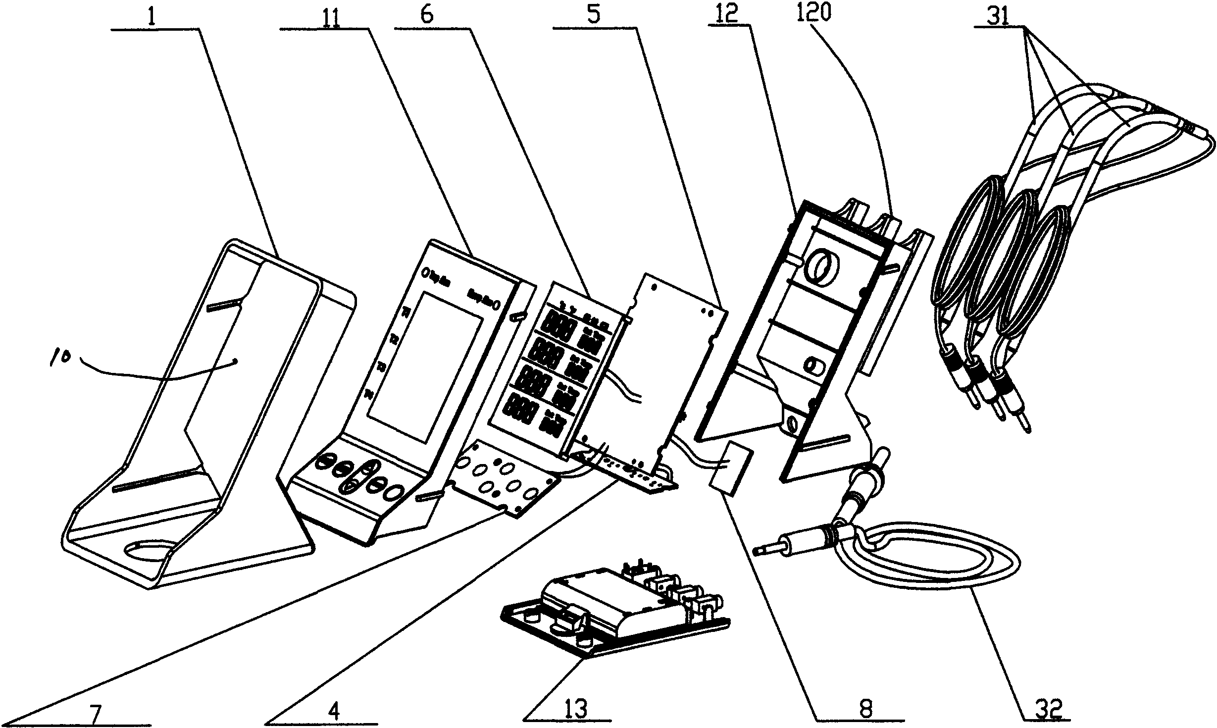 本实用新型公开了一种烧烤专用温度计,包括基座、前壳体、带支架的后壳体和底壳体,设有开放式敞口的基座呈倒置且后倾的T字形,前壳体分装有LCD显示屏、按键线路板,后壳体装有主线路板,底壳体装有探针导孔线路板,按键线路板连接主线路板,测肉温度探针插置到食物中,且其接线端插接于探针导孔线路板相应的导孔内,测烤箱温度探针伸入烤箱内,且其接线端插接于探针导孔线路板相应的导孔内,测肉温度探针和测烤箱温度探针均内置有温度传感器,探针导孔线路板、主线路板和LCD显示屏依次连接。该烘烤专用温度计可精确测定并实时显示食物内部的烤制温度和烤箱温度,可防止烤坏食物,避免食物外焦里生现象的发生;基座设计方便按键操作、探针拆装。