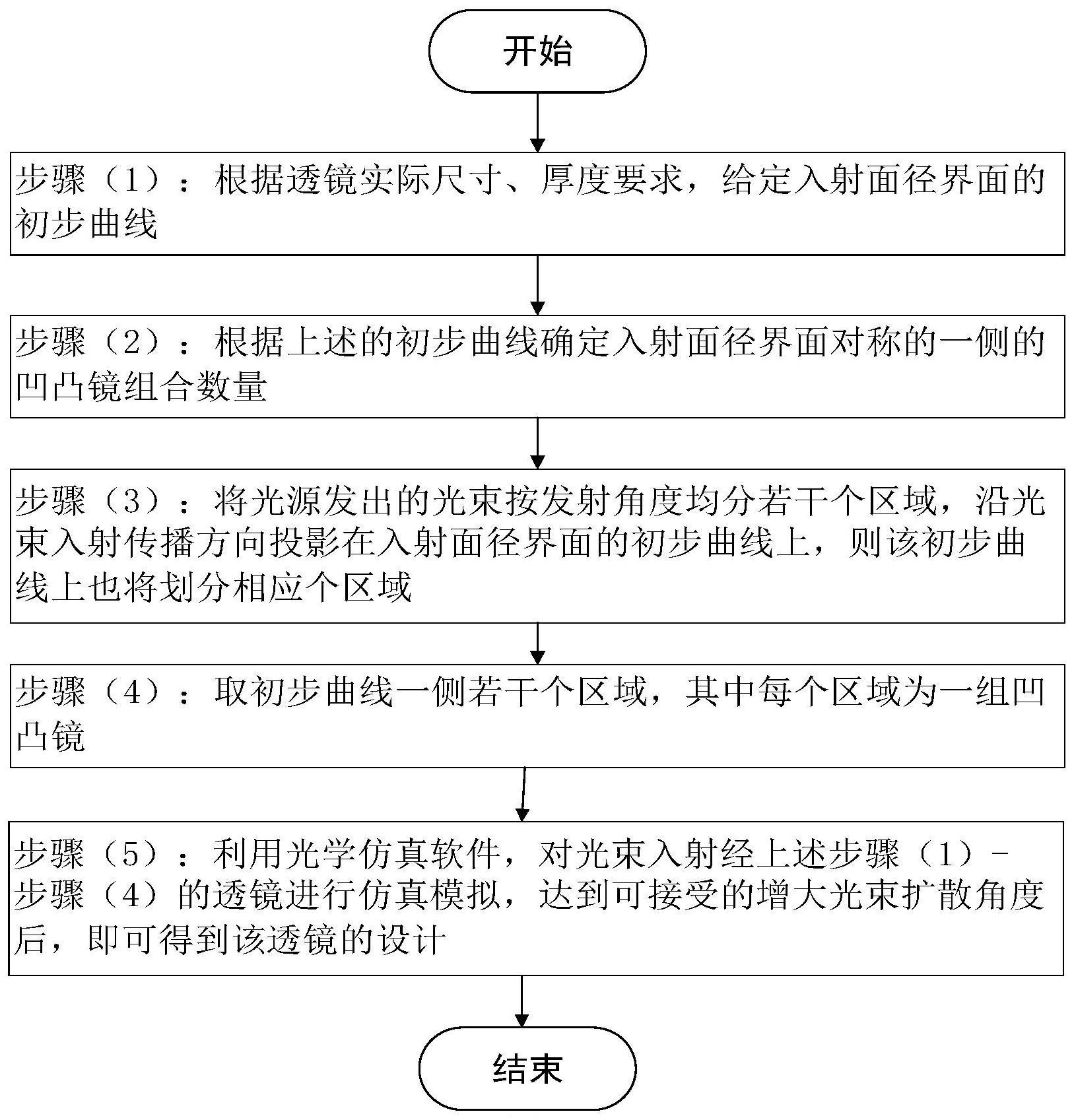 本发明提供了一种增大光束传播散射汇聚角度的透镜及制造方法,包括:曲面,所述曲面一侧设有若干组凹凸镜,所述每组中凹镜与凸镜相连,所述曲面一侧设有若干个区域,分别设有一组所述凹凸镜,所述每组中凹镜的径向高度大于所述凸镜的径向高度,本发明结合几何学投影原理,分析光束在入射面的入射角度变化分布,模拟出入射纵截面高阶次连续的曲线,来设计“凹/凸透镜”合理的组合;并通过光学软件仿真,验证光束扩散效果,通过不断调整入射曲面进行优化;之后以PC为材质,波长为960nm的红外光源提供光束,对所设计的透镜进行实验,再进行设计优化;最后提出FFT.Ken透镜。