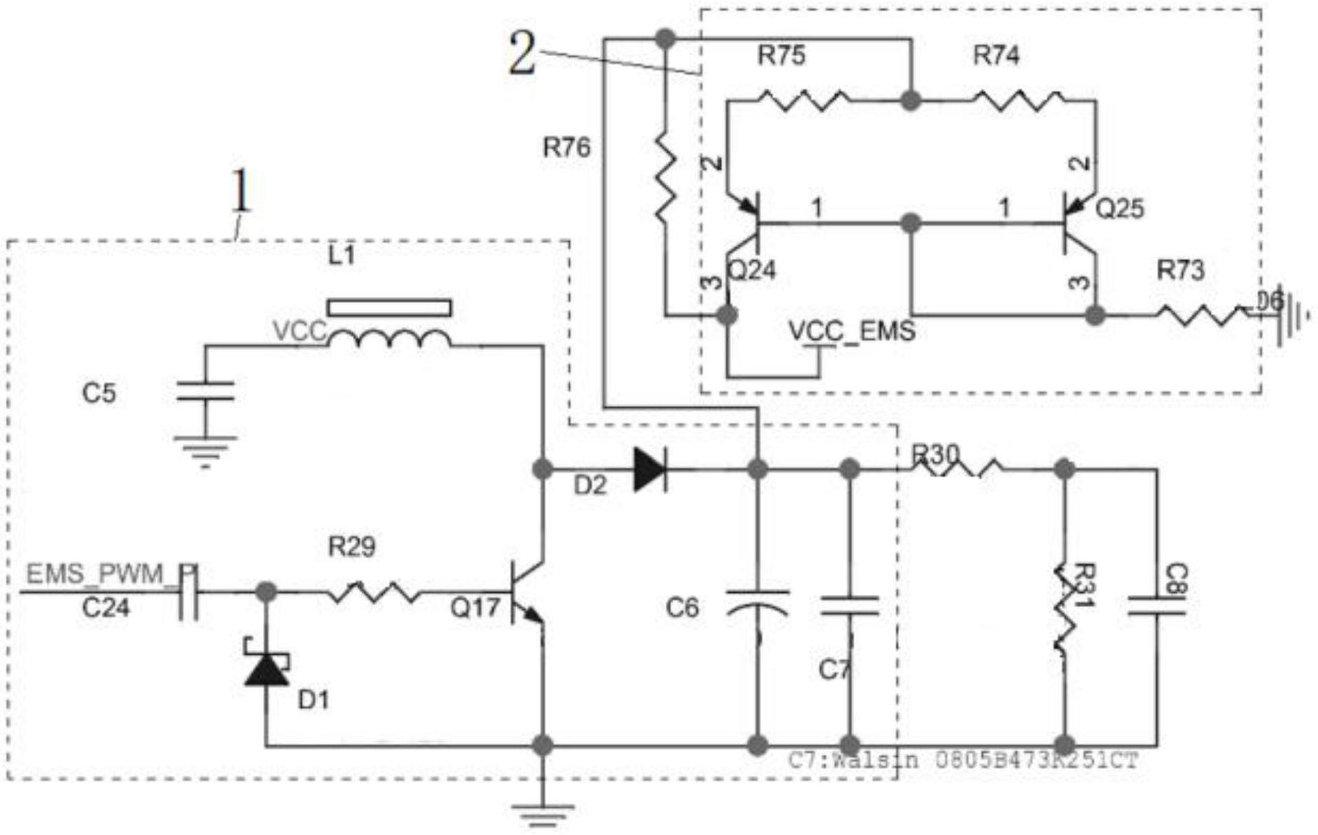 本实用新型涉及按摩仪技术领域,尤其涉及一种恒定电流脉冲输出方式的按摩仪电源电路,一种恒定电流脉冲输出方式的按摩仪电源电路,包括boost升压电路和镜像恒流源电路,所述boost升压电路的输出端分别连接有电阻R30和电阻R31,且电阻R30和电阻R31的输出端均连接有电容C8。本实用新型中,将常用的电压型脉冲输出方式改成电流型脉冲输出方式,电流型脉冲能在不同人体皮肤阻抗条件下,输出相同的脉冲电流,利用三极管、二极管,电阻、电容、电感,实现恒定电流脉冲输出的按摩仪电路,相比市面上的按摩仪,电流型脉冲按摩方式,能更好地适应人体的阻抗差异,获得更为一致的使用感受,应用范围也更为广泛。