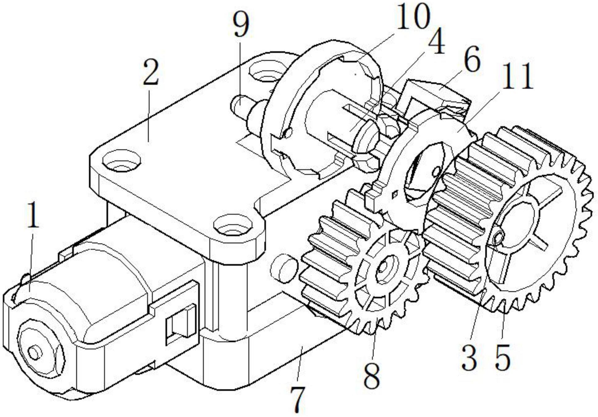 本实用新型公开了一种冲牙器用比例阀,包括减速电机、盖板、底座和限位架,所述底座上安装有减速电机,所述减速电机的上方盖放有盖板,所述盖板与底座通过螺丝连接固定,所述盖板的顶部表面设有限位架,所述限位架的一侧设有出水口,所述限位架背离出水口的一侧设有从动齿轮,所述从动齿轮上设有进水口,所述减速电机的一侧设有传动齿轮,所述传动齿轮与从动齿轮传动连接,所述盖板位于从动齿轮的一侧设有微动开关,所述进水口上设有压块,且所述进水口的压块与微动开关的压板相接触。本实用新型具备支持将清水和漱口水按一定比例混合的功能的优点。