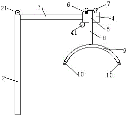 本发明属于纺织用具技术领域,尤其涉及一种纺织布简易打包机的导线装置。本发明公开了纺织布简易打包机的导线装置,纺织布简易打包机的导线装置包括支撑杆,所述的支撑杆的顶端设有水平连杆,所述的水平连杆的一端与支撑杆垂直相连,所述的水平连杆的另一端连有导向板,所述的导向板上开设有贯穿导向板上下面的缝隙,所述的导向板上沿着缝隙的两侧开设有导轨,所述的导轨上设有两组滑轮,所述的两组滑轮通过悬挂板相连,所述的悬挂板穿过缝隙后连有导向件,所述的导向件呈倒丫字形,所述的导向件的端部各设有一导向孔。本发明的有益效果是:能够使得纺织布的打包操作更加的简便,打包操作现场更加的整洁有序。
