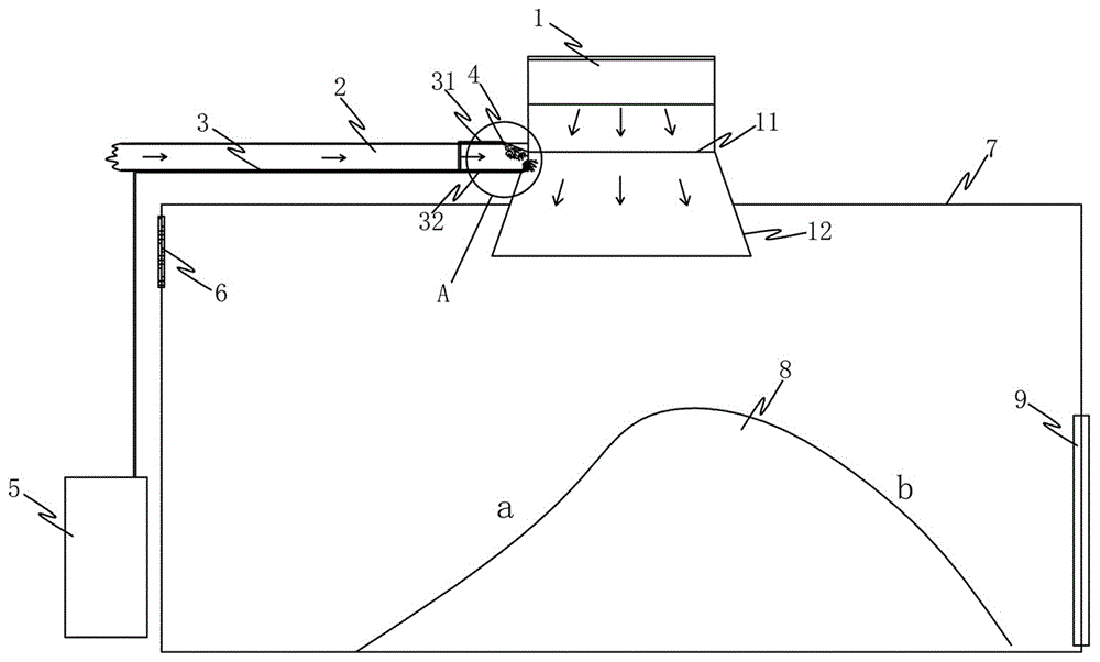 本实用新型公开了一种和毛仓喷淋装置,用于向进入和毛仓内的纤维喷淋和毛油,包括微风机、输送管道、喷淋管道、雾化喷头,输送管道用于输送开松的纤维,输送管道的输出端口垂直进入微风机的风力范围内,输送管道上靠近输出端口的位置设置有多个喷淋口,喷淋口设置有雾化喷头,使得喷淋管道内的和毛油雾化喷淋在开松的纤维上后被输送至微风机的风力范围内,使得微风机的风力能够吹落开松的纤维且抑制开松的纤维上扬。本实用新型通过在开松纤维的输送管道内将和毛油雾化喷淋,能够将和毛油与纤维充分接触,优化喷淋效果,同时通过微风机吹落纤维,扩大纤维的落地范围,纤维堆积范围加大,降低堆积对产品开松效果的影响。