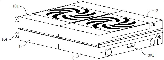 本实用新型公开了一种涤纶线生产加工用的除尘装置,涉及涤纶线生产技术领域。本实用新型包括除尘盒、第一延长架和第二延长架,除尘盒上侧转动卡接有除尘盖,除尘盖内侧上端贯穿卡接有第一抽风机,除尘盒和除尘盖一侧皆卡接固定有气泵,气泵后端贯穿卡接有吸盘,除尘盒和除尘盖另一侧皆卡接固定有第一数据连接头,除尘盖一侧吸附固定有第一延长架,第一延长架内侧上端贯穿卡接有第二抽风机,除尘盒一侧吸附固定有第二延长架。本实用新型通过除尘盒、第一延长架和第二延长架,解决了涤纶生产过程中需要的除尘装置数量较多,空间利用率低,不便于人员操作,装置尺寸固定,使用灵活性较低的问题。