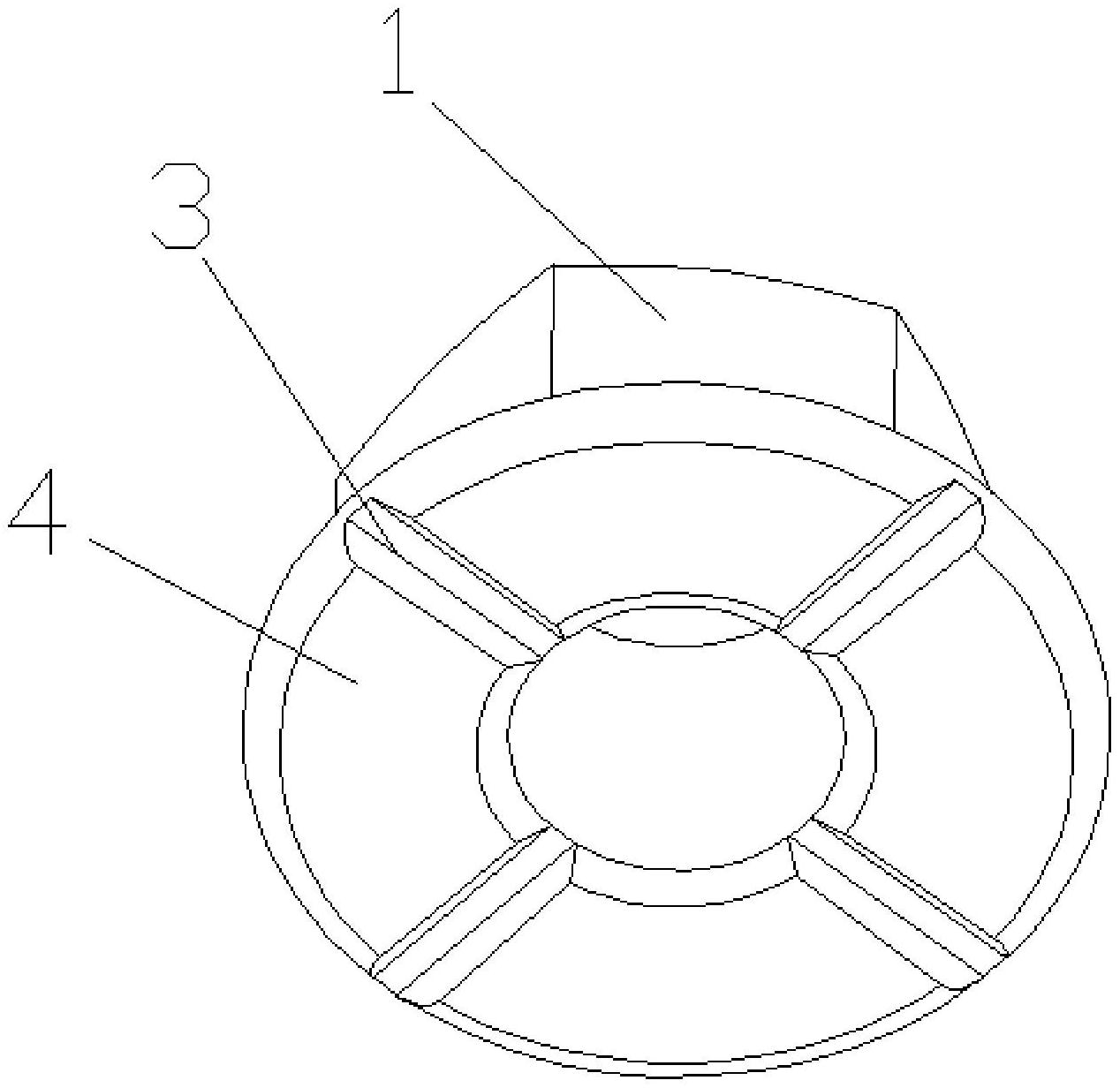 本实用新型涉及一种防电泳兜液和兜气的螺母,包括本体,螺母的本体固定在悬置支架上,本体的下表面为螺母端面,螺母端面与悬置支架焊接固定,螺母端面上设有细长的凹槽,凹槽的两端延伸到螺母端面的中心和外边缘,形成排出通道。本实用新型有益的效果是:本实用新型在螺母端面增设了若干个细长的凹槽,避免了焊接后螺母端面与支架完全贴合密封,可以有排气和漏液的通道,在不改变产品工艺和性能的前提下,避免了电泳时兜液或兜气,保证了漆膜质量。