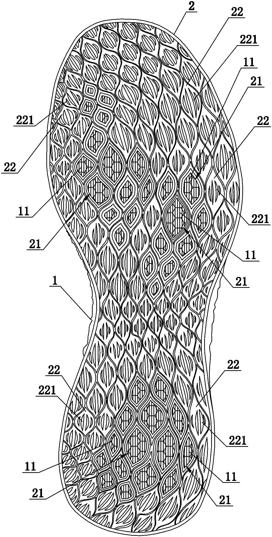 本实用新型涉及一种防滑缓震鞋底,包括中底以及大底,大底贴设于中底底沿。上述大底设有复数个防滑缓震孔,防滑缓震孔贯穿大底设置,防滑缓震孔布设于大底的掌部与跟部。上述中底底沿设有复数道缓震凸棱,缓震凸棱沿中底长度方向平行布设于中底掌部与跟部,缓震凸棱与上述防滑缓震孔配合设置。本实用新型通过防滑缓震孔的设置,在增强大底底面的摩擦力的同时,可以令中底在位于防滑缓震孔处可以有一定形变空间,进而增强中底在防滑缓震孔处的缓震性能,而缓震凸棱的设置,随着中底受压形变后,防滑缓震孔处的中底底面与地面接触,缓震凸棱的设置可以增加该种情况下防滑缓震孔处的防滑性能以及提升该处的耐磨性能。